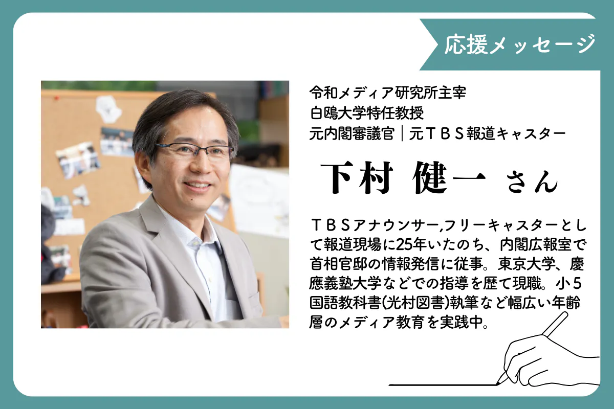 令和メディア研究所主宰 下村健一様から、本プロジェクトへの応援メッセージをいただきました。