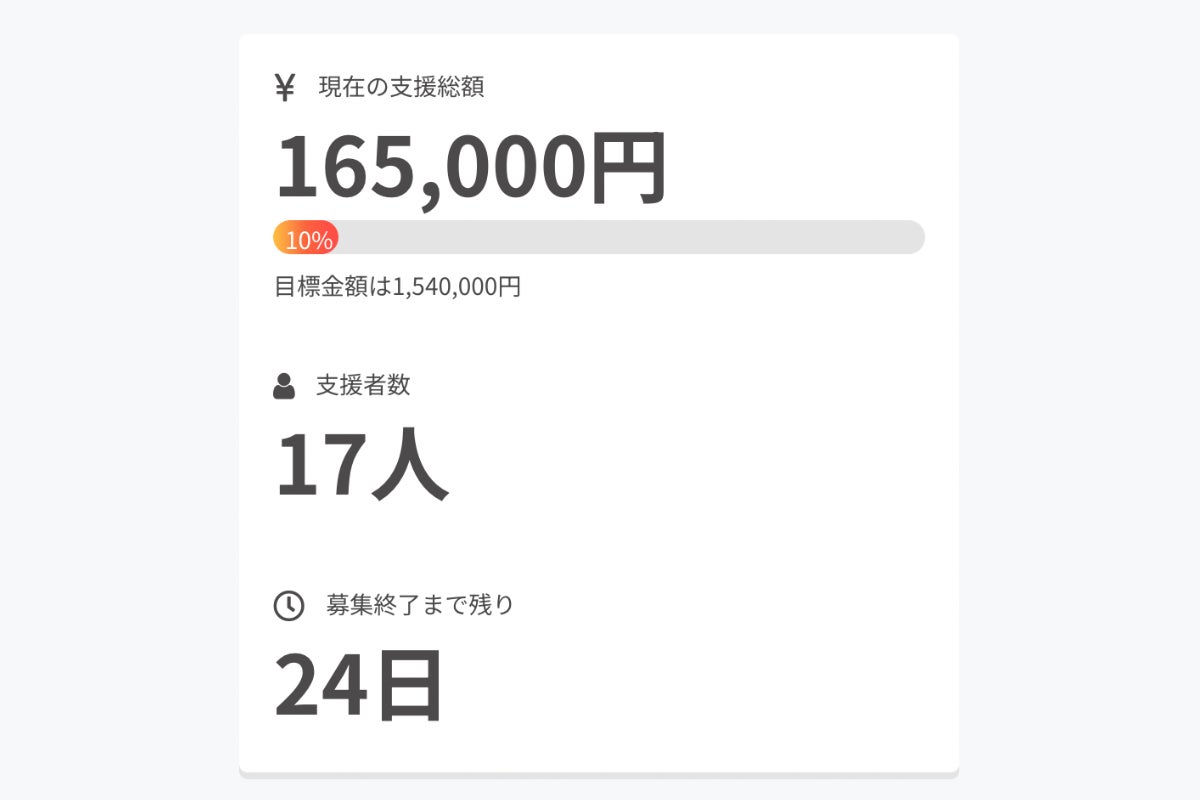 ご支援いただきありがとうございます。この度、支援総額の10%を達成しました!ご友人へのご紹介やSNSへの投稿でシェアいただくことでも励みになります。引き続き皆様のご支援をどうぞよろしくお願いいたします。