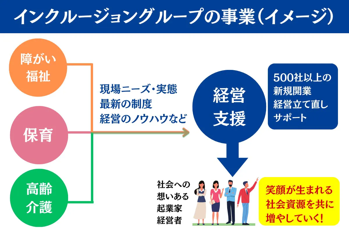 私自身、2013年5月に株式会社インクルージョンを立ち上げた当時、ワクワクはもちろんですが不安な気持ちも大きかったのを覚えています。ただ、弊社の経営目標の1つでもある「足りない社会資源は自ら創る」という想いを胸に経営支援事業をスタートしました。机上の空論にならないよう翌年には、就労継続支援事業所、児童発達支援・放課後等デイサービスを開業。現在は自社で障がい・保育・介護の3分野で経営し、100人以上のスタッフのいる会社となれました。