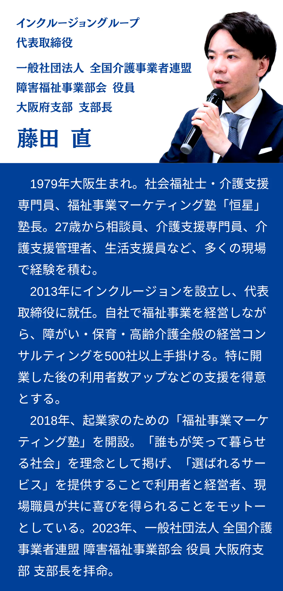 はじめまして。「誰もが笑って暮らせる社会を創る」を理念に、障がい・保育・介護の3事業を経営しながら、事業所の新規開業・立て直しなどの経営支援事業をおこなっているインクルージョングループ代表取締役の藤田 直(なおき)と申します。