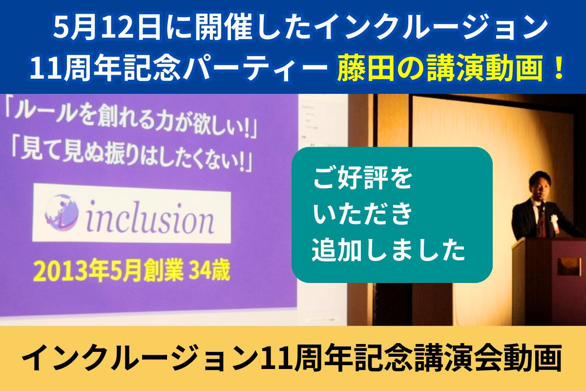 5月12日に開催した11周年記念パーティーでの藤田の講演「誰もが笑って暮らせる社会を創る〜11年の軌跡とこれから〜」について、ご好評と嬉しいご感想をたくさんいただいたので、講演動画データのリターンをご用意しました。