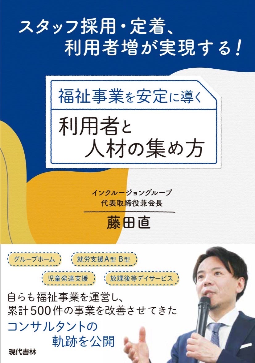 はじめまして。「誰もが笑って暮らせる社会を創る」を理念に、障がい・保育・介護の3事業を経営しながら、事業所の新規開業・立て直しなどの経営支援事業をおこなっているインクルージョングループ代表取締役の藤田 直(なおき)と申します。