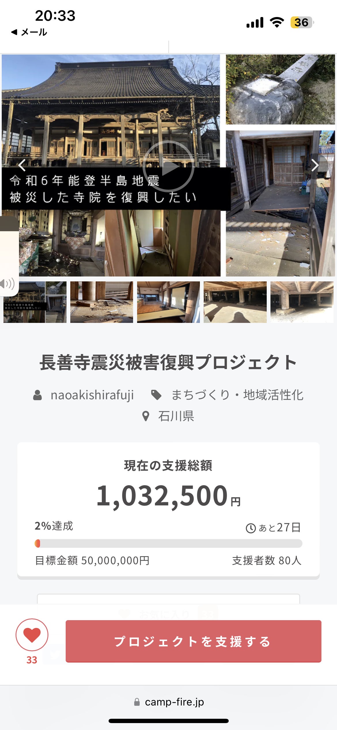 2024/03/02 21:17久しぶりの活動報告になります。先日支援額が100万円に到達しました。皆さま支援、拡散等にご協力ありがとうございます。このクラウドファンディングの活動について門徒の代表の方々に報告行いました。知り合いはもちろん、面識のなかった方々もお寺のために支援してくださっている現状に驚き、感謝してくださっていました。このプロジェクトは3月末で終わりますが、皆さまからいただいた思いをしっかり復興に向けていきたいと思いますので、残り1ヶ月、無理のない範囲で、力貸したいただけると幸いです。3月ですが今日は雪も降りました。暖かくしてお過ごしください。 もっと見る