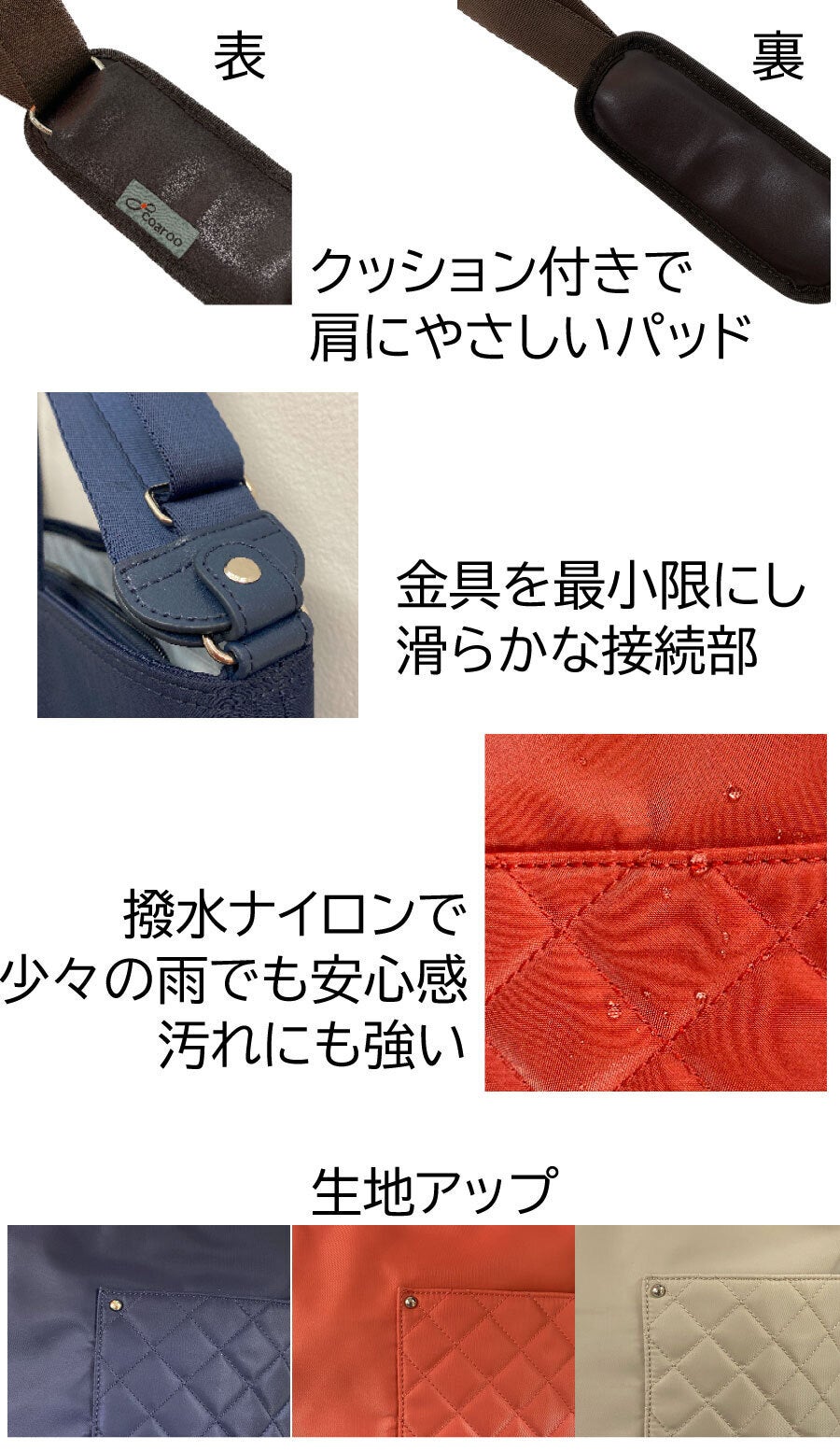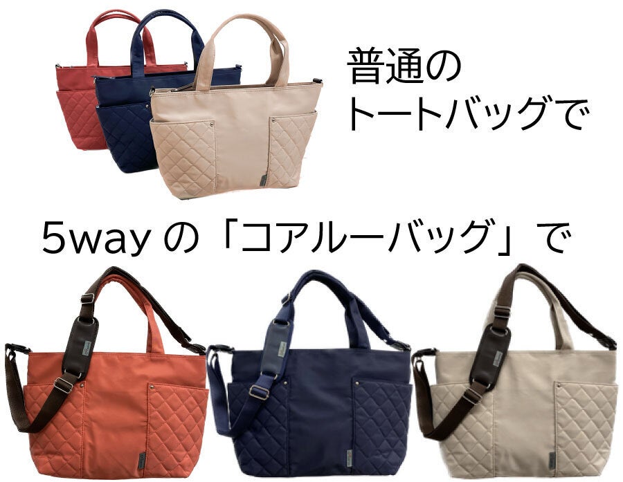 ユーザーの方々のご要望にお応えして、今までの縫い付け方式から「付け替え方式」を採用した新商品をご紹介します。普通のトートバッグとして、付属のコアルーストラップを付けて「コアルーバッグ(5way)」として、またそのコアルーストラップを他のバッグに付けてコアルー化もできる、ブランドバッグも、革のかばんも…。すると一石何鳥?