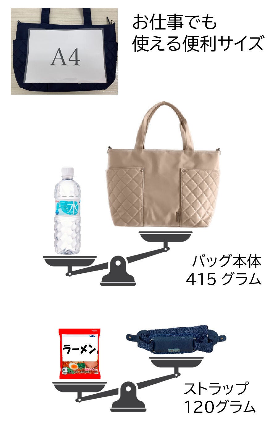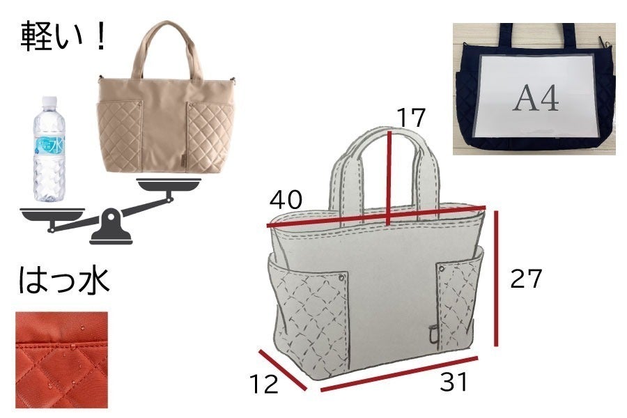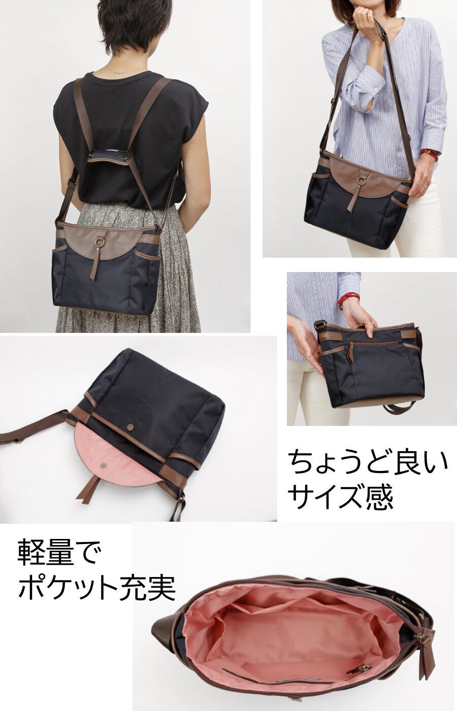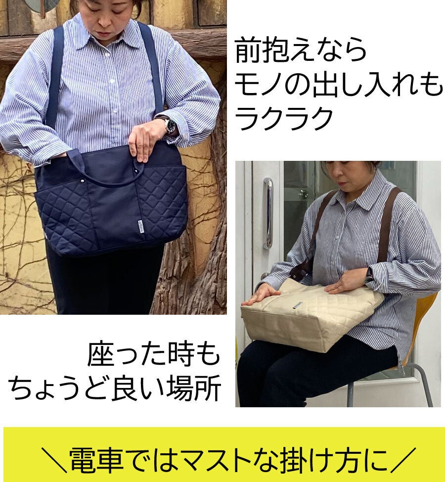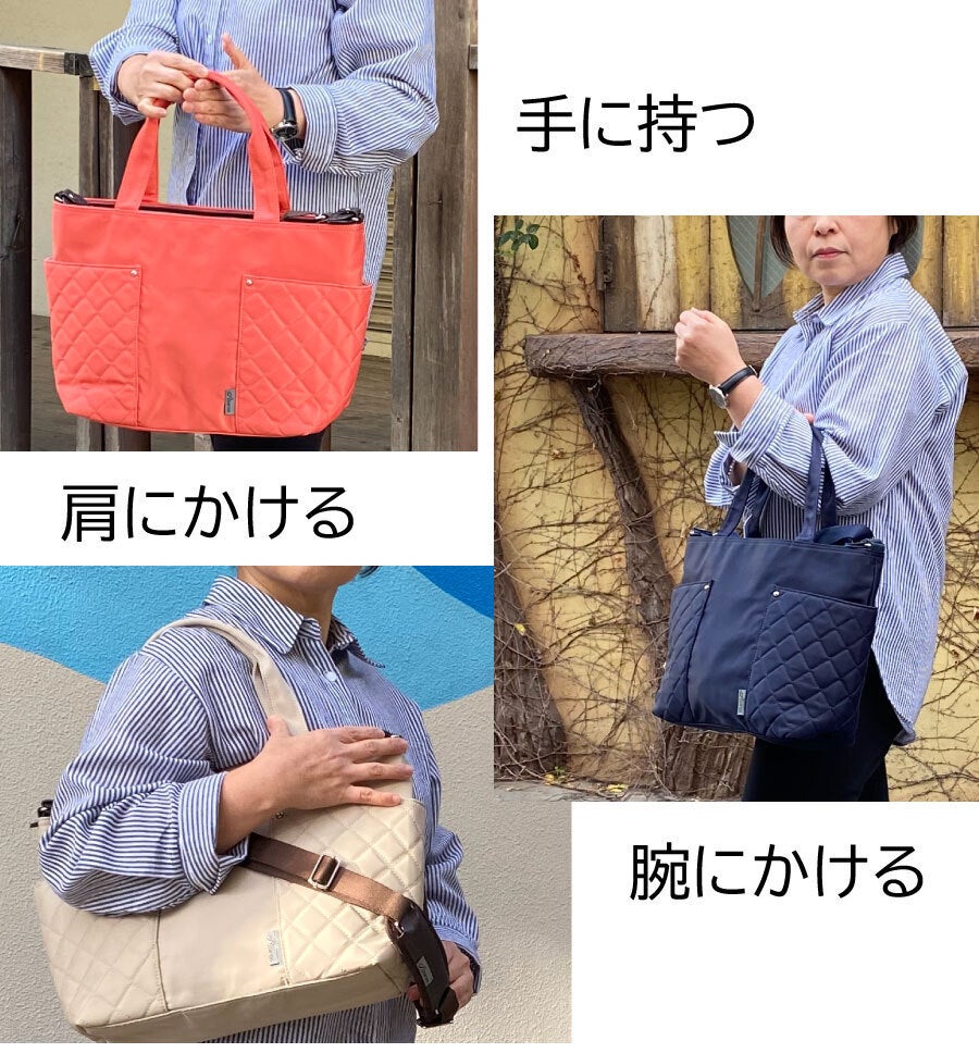 荷物が多い時、片方の肩だけでは辛く、トートでも重さが偏りがちです。ささっとリュックに変身すれば、両肩に重さが分散して、それはそれはラクになります。自転車では特におススメです。キレイ目のバッグをカゴに入れたくない!雨の日や他に荷物がある時も…。ちょっと下だけど意外と安定してフィット感もちゃんとあるのでぜひ試してみてください。