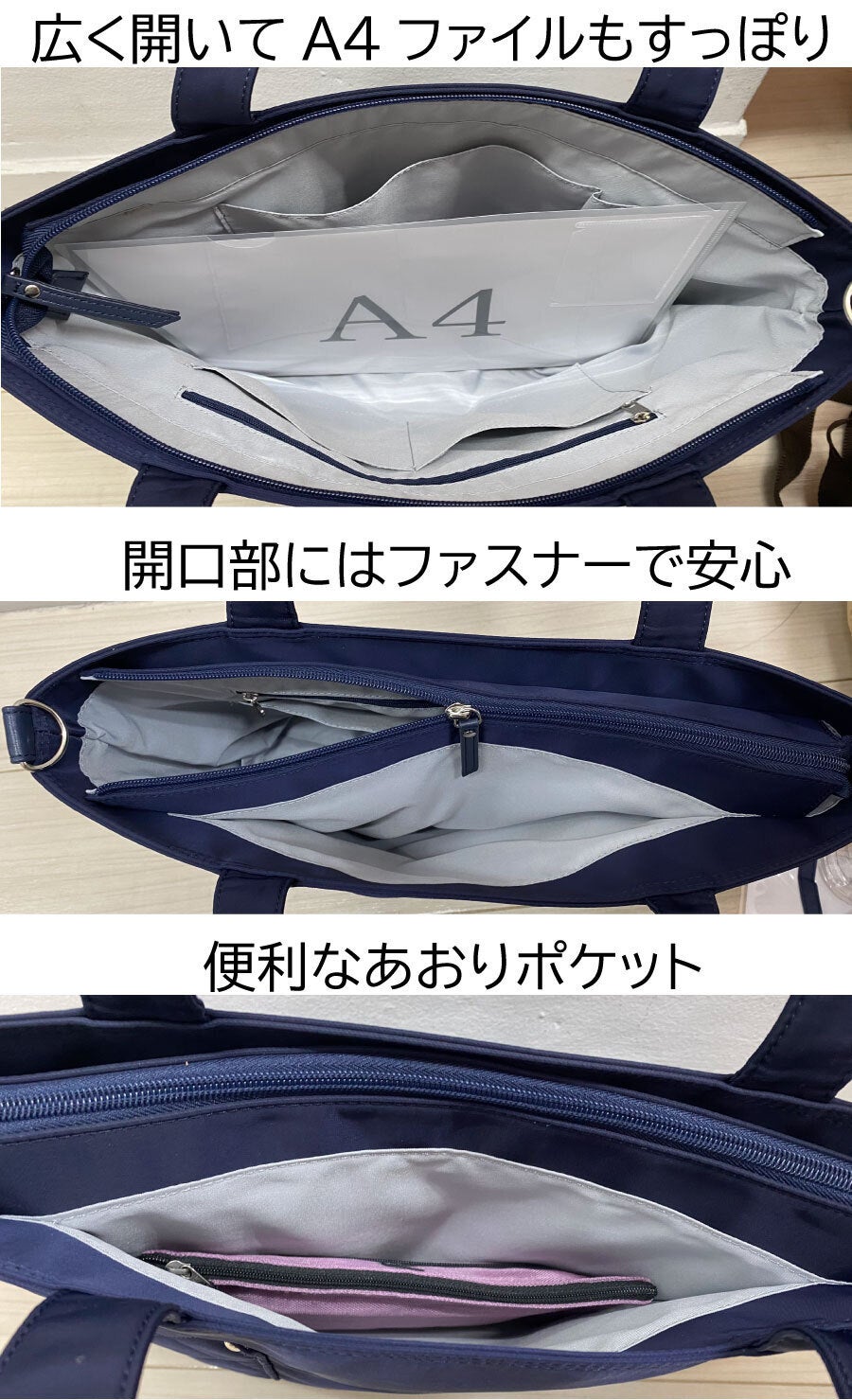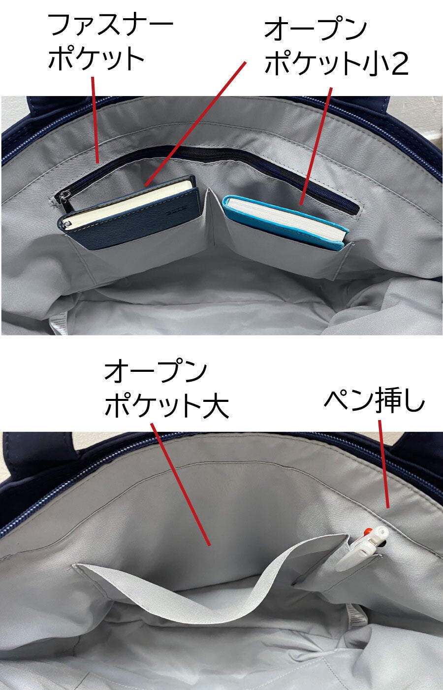 ポケットはあまり数が多くても何をどこに入れたか分からなくなるもの。程よい数で、裏地を明るい色にして使いやすくしました。