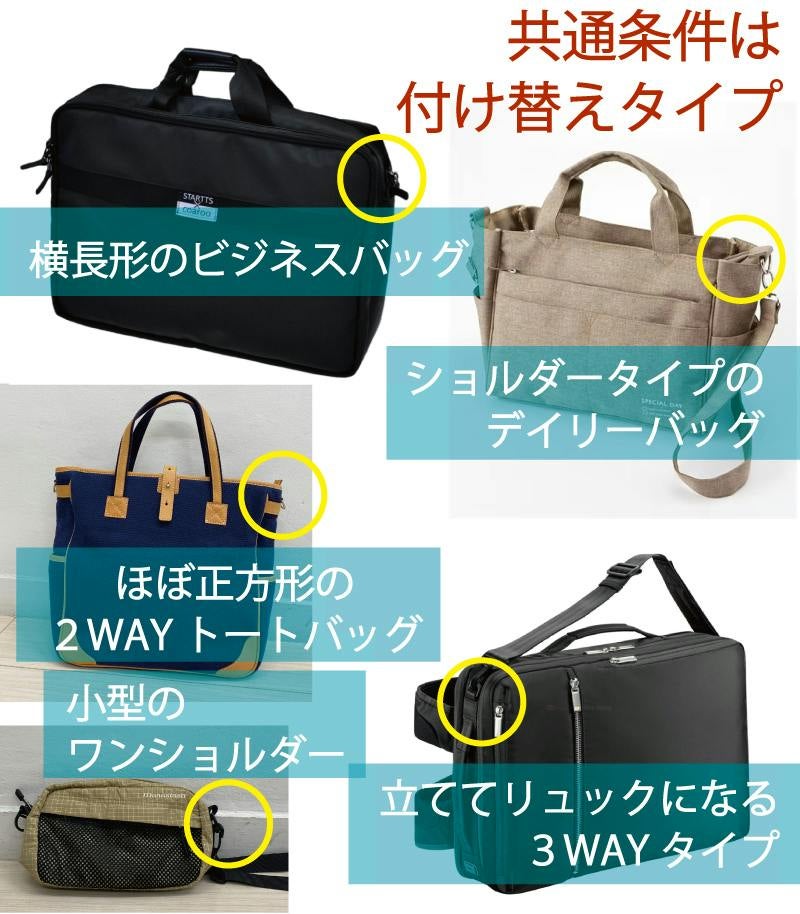 そして付属のストラップは、取り外して他のバッグにも付けられるので、ぜひ活用してみてください。今まで使いづらくてしまい込んでいたカバンも復活して「捨てなくてよかった~」と思われるかも。以下のようなカバンは特にコアルーバッグにするには向いています。