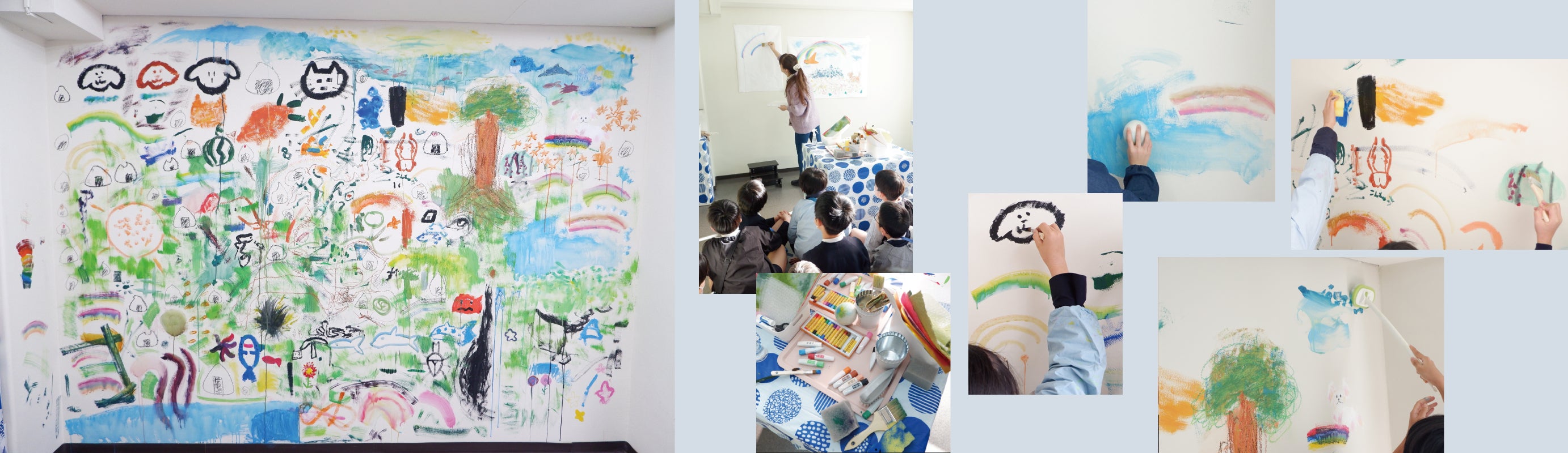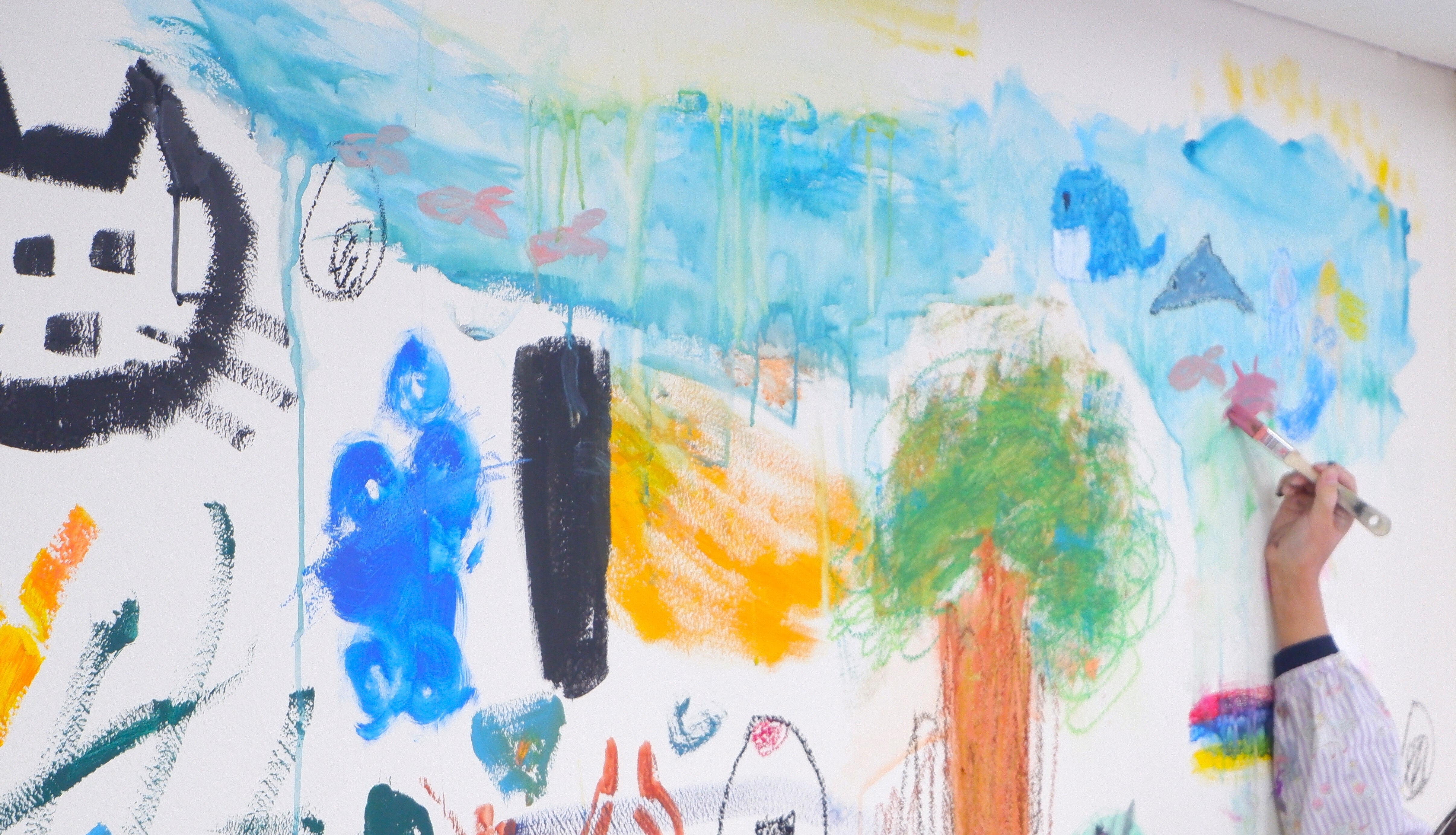 その第一歩として、1月18日にギャラリーの工事前に、広い壁面に地域の小学校の生徒さんたちに「癒し」をテーマに壁画を描いてもらうWSを実施しました。筆やスポンジ、たわし等、いろいろな道具を使って、楽しそうに制作している子供たちを見て、とてもうれしくなりました。一つの絵をみんなで制作する体験にもなりました。