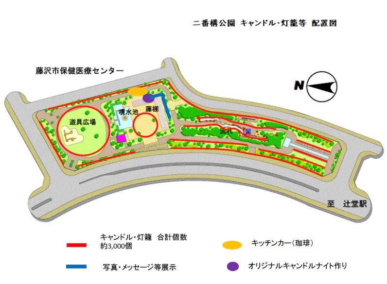 赤い線のところにキャンドルを設置。当日公園に来れなくてもお家から少しでも楽しめるよう3,000個の”あかり”を灯します。また、当日は集まった方々と一緒にキャンドル作り等ワークショップを通し全く知らない人同士でも何かを共にすることで、言葉ではない、あたたかな繋がりを育みたいと思っています。
