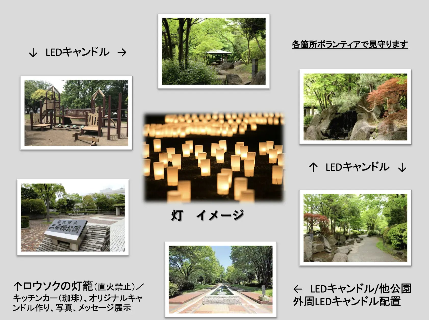 一人ひとりの想いと共にキャンドルに”あかり”を灯し、いくつもの”あかり”で公園を包もうと思います。世の中には被災者、被災地へむけて沢山の活動をされている方々もいらっしゃいますが、今回は何かをさせてもらう事ではなく”あかり”を通して、3.11の出来事に触れることで、視野を広げ、他方からみるそれぞれの想いを感じ、それぞれの願いや祈りをそれぞれの未来へ繋げるきっかけを創りたいです。