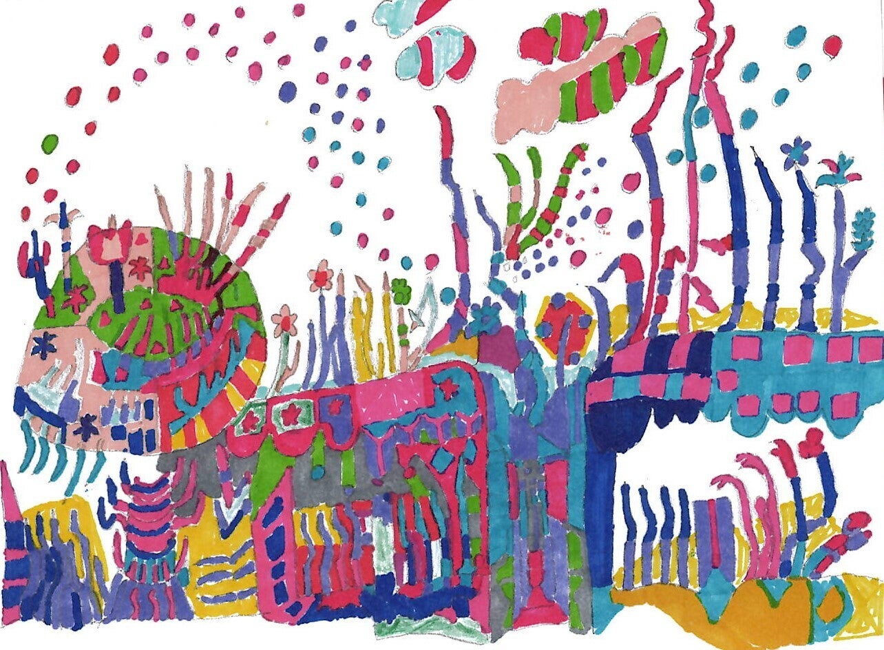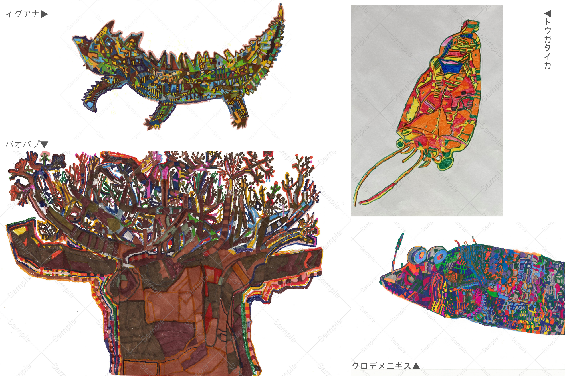 二宮さんは、鉛筆で下書きをした上から、マーカーペンで感性のまま自由に模様を刻んでいく手法で作品を仕上げています。