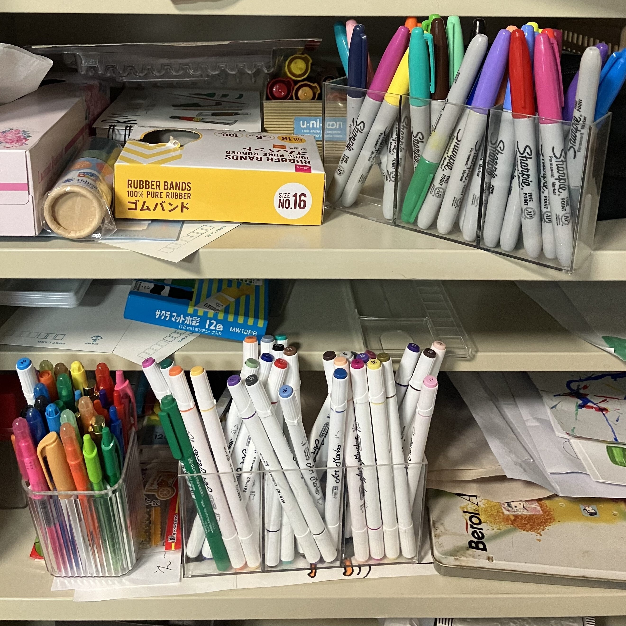 保護者が仕事で家にいない時間、二宮さんはおばあさんの傍でじっと絵を描いていたそうです。そしておそらく二宮さんにとって絵を描くこととは、鉛筆の黒一色で表現することだったのでしょう。実際、この施設に通い始めた頃(2、3年前)の二宮さんは、作業場の棚に並ぶカラフルなマーカーペンの中でも、片手で数えられるほどの色数しか使えなかったそうです。