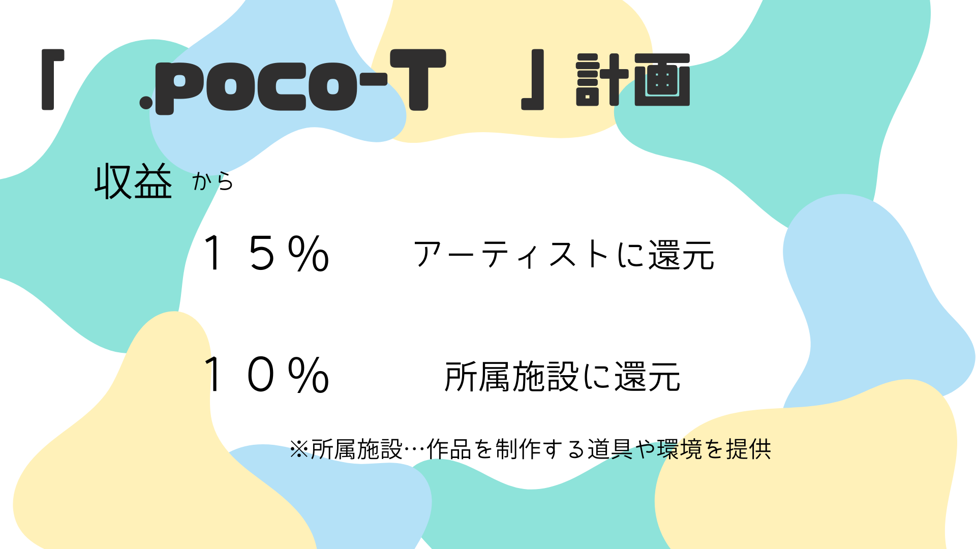 施設に所属しているアーティストと個人契約を結び、ブランド「 .poco 」(ドットポコ)でオリジナルTシャツを作成・販売したいと考え、動き出しました。これが、「 .poco-T 」(ドットポコティー)計画です。