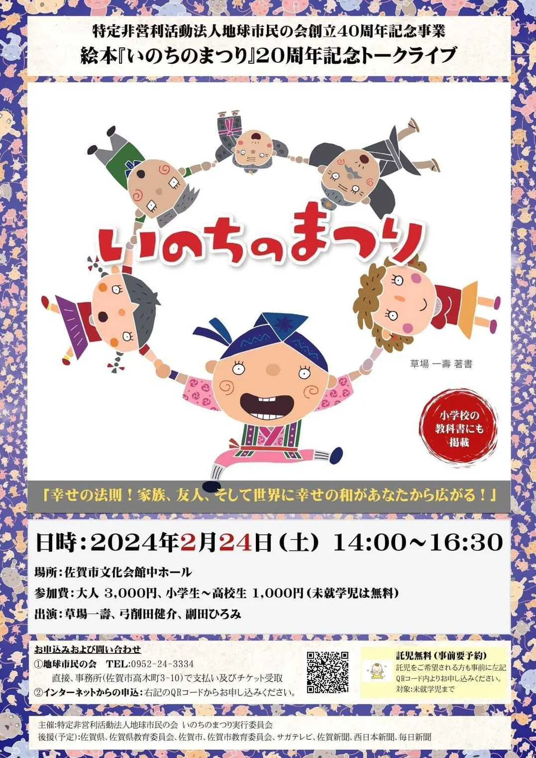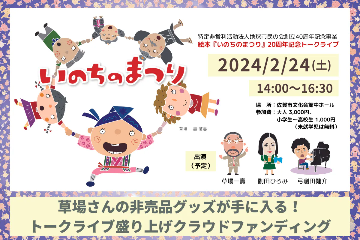 こんにちは!私たちは地球市民の会という認定NPO法人です。佐賀を拠点に、1983年から国際交流・国際協力・地域づくりなどの活動を続けてきました。地球市民の会は、今年で40周年を迎えました。40周年を記念して、2月24日(土)に絵本『いのちのまつり』トークライブを実施することにいたしました。