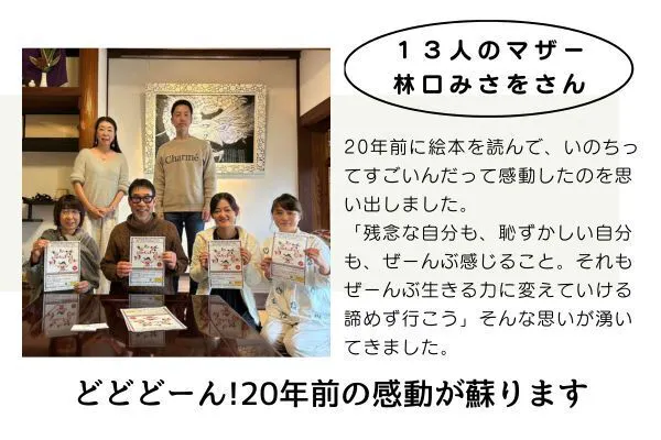 あっと言う間の20年。20年前は、私は草場さんのマネージャーをしていて全国を飛び回っておりました。そして、私が理事をしております地球市民の会の創設者である古賀武夫先生は、草場さんの叔父様と言うご縁があり、「この本は世に出さんば!」という皆の想いが集まりました。あっと言う間に「いのちのまつり」は全国に広がり、自費出版からサンマーク出版へと羽ばたいて行きました。時代が求めていた絵本です。