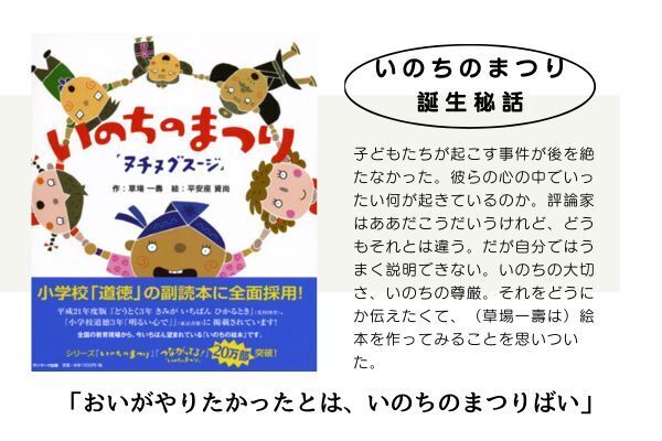 平成十二年五月、佐賀県で西鉄バスジャック事件が起きた。十七歳の少年が人質の乗客三人を牛刀で切りつけ、女性が一人死亡した。その三年前には神戸での連続児童殺人事件。いじめの問題も含め、子どもたちが起こす事件が後を絶たなかった。彼らの心の中でいったい何が起きているのか。評論家はああだこうだいうけれど、どうもそれとは違う。だが自分ではうまく説明できない。いのちの大切さ、いのちの尊厳。それをどうにか伝えたくて、(草場一壽は)絵本を作ってみることを思いついた。