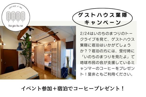 2/24はいのちのまつりのトークライブを見て、ゲストハウス葉隠に宿泊はいかがでしょうか??宿泊の方には、受付時に「いのちのまつりを見たよ」で地球市民の会が支援しているミャンマーのコーヒーをプレゼント!是非ともご利用ください。