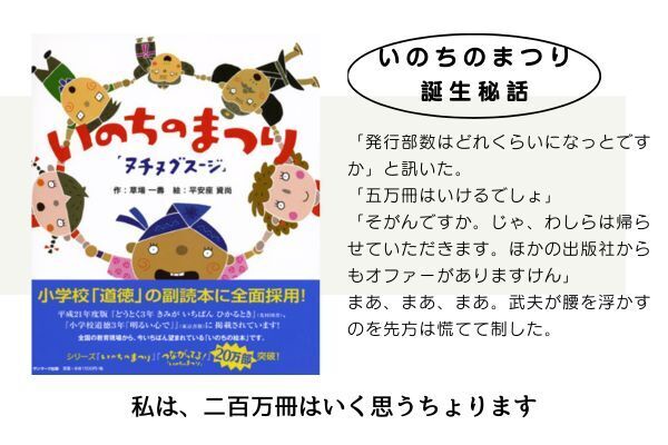 原作・草場一壽、絵・平安座資尚、監修・古賀武夫。『ヌチヌグスージ~いのちのまつり』は、初版五万部からスタートし、十年で三十九万部を売るロングセラーになった。一壽は、同社からいのちのまつりシリーズ五作を立て続けに出し、そのうち三作が小学校の道徳や生活科の副読本に採用された。これらの採択数も含めれば、累計二百万冊を優に超え、武夫の言ったことが本当になった。