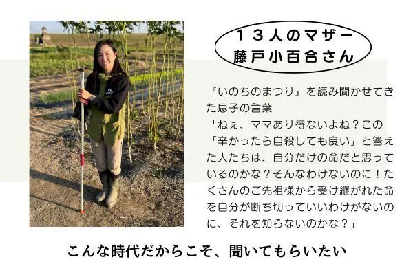 本日は、いのりのまつりトークイベントの実行委員「13人のマザー」の一員である、藤戸小百合さんのFacebook投稿をご紹介します♪藤戸さんは、地球市民の会の理事でもあり、『いのちのまつり』作者の草場一壽さんの従妹でもあります。