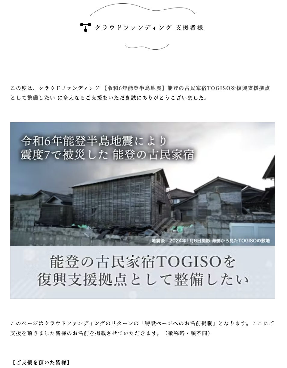 10,000円以上のご支援をくださった方については、能登の古民家宿 TOGISO 公式HPの特設ページにお名前を掲載しました。
