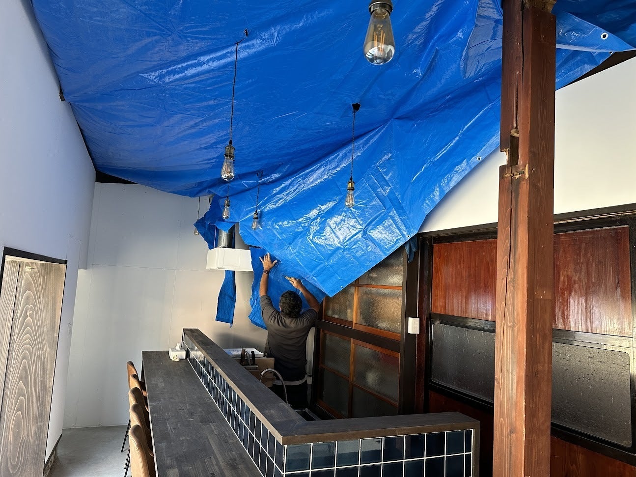 工事に伴う振動が発生するため、カフェスペースには塵や埃が落ちないよう天井が養生されています。
