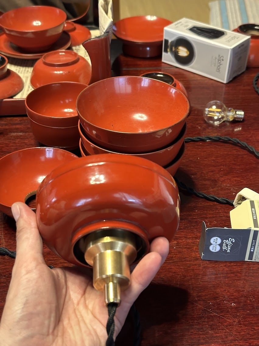 いくつかのサンプルの中から選ばれたのは、輪島塗の大平椀をベースとして、真鍮の削り出しで灯具をデザインしたものでした。