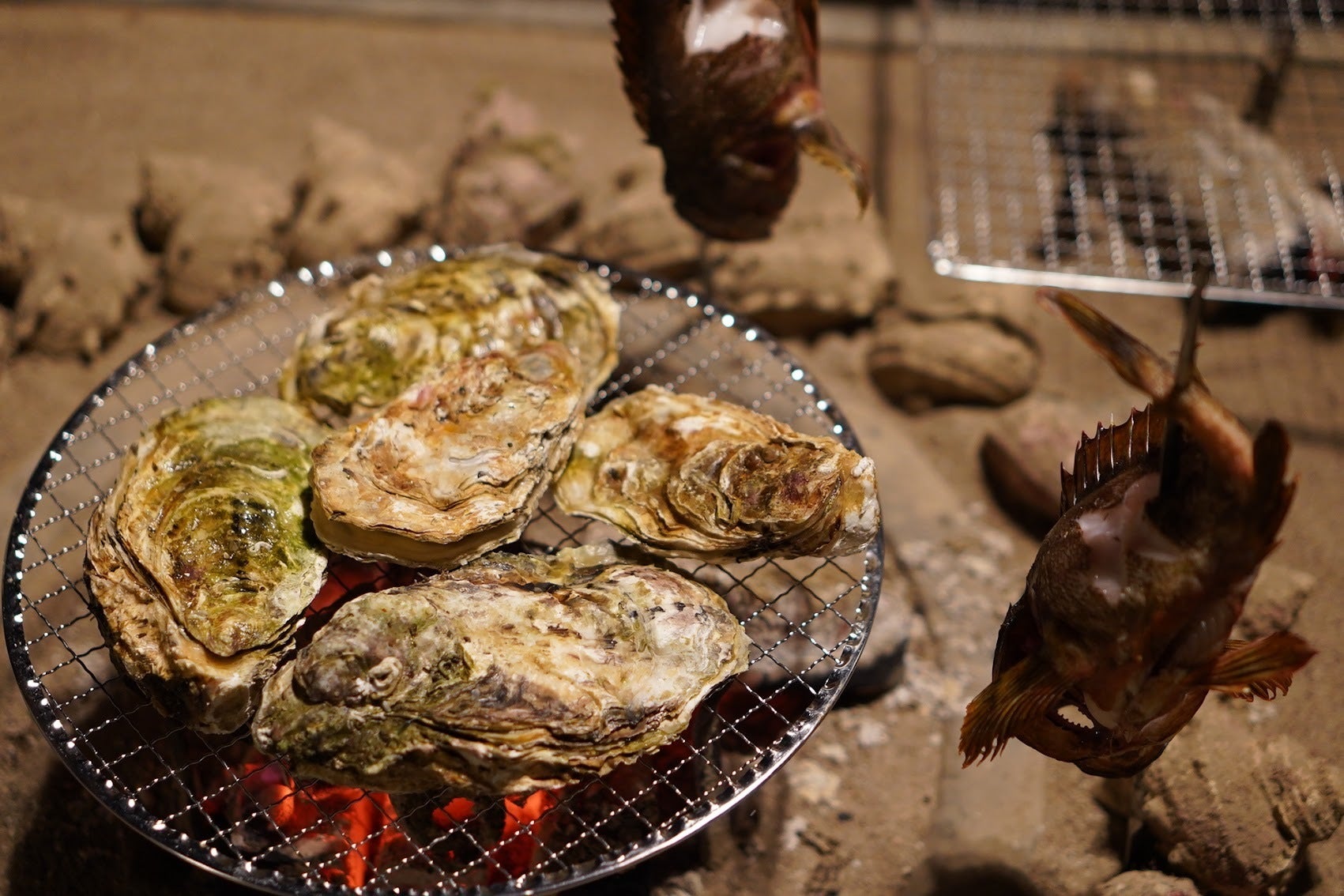 地震前 2023年2月24日撮影 囲炉裏で焼く能登ガキと釣ったカサゴ
