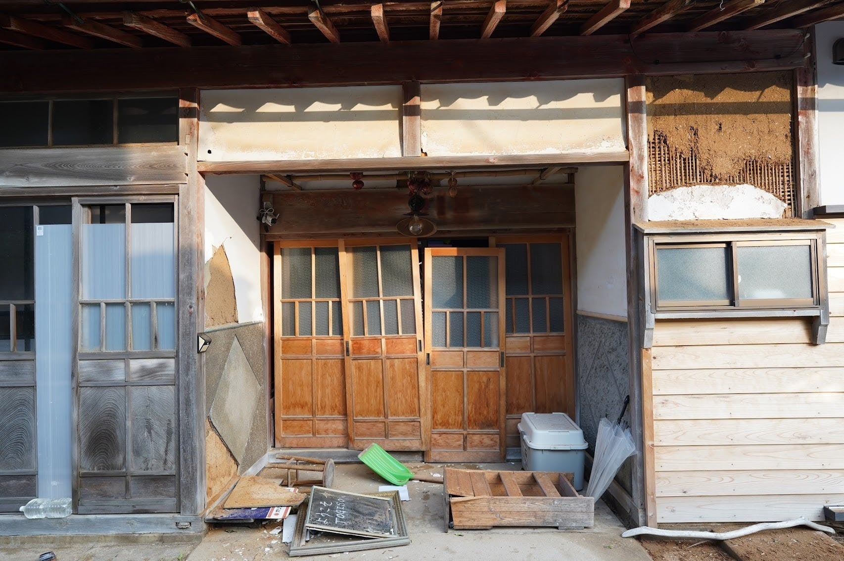 被災後すぐに現地を訪れTOGISOの状態を確認すると、瓦が落ちて雨漏りがあり、ドアはひしゃげてガラスが割れ、壁は剥がれていました。もちろん、中はぐちゃぐちゃですが、前述の通り建物の躯体はしっかりしています。