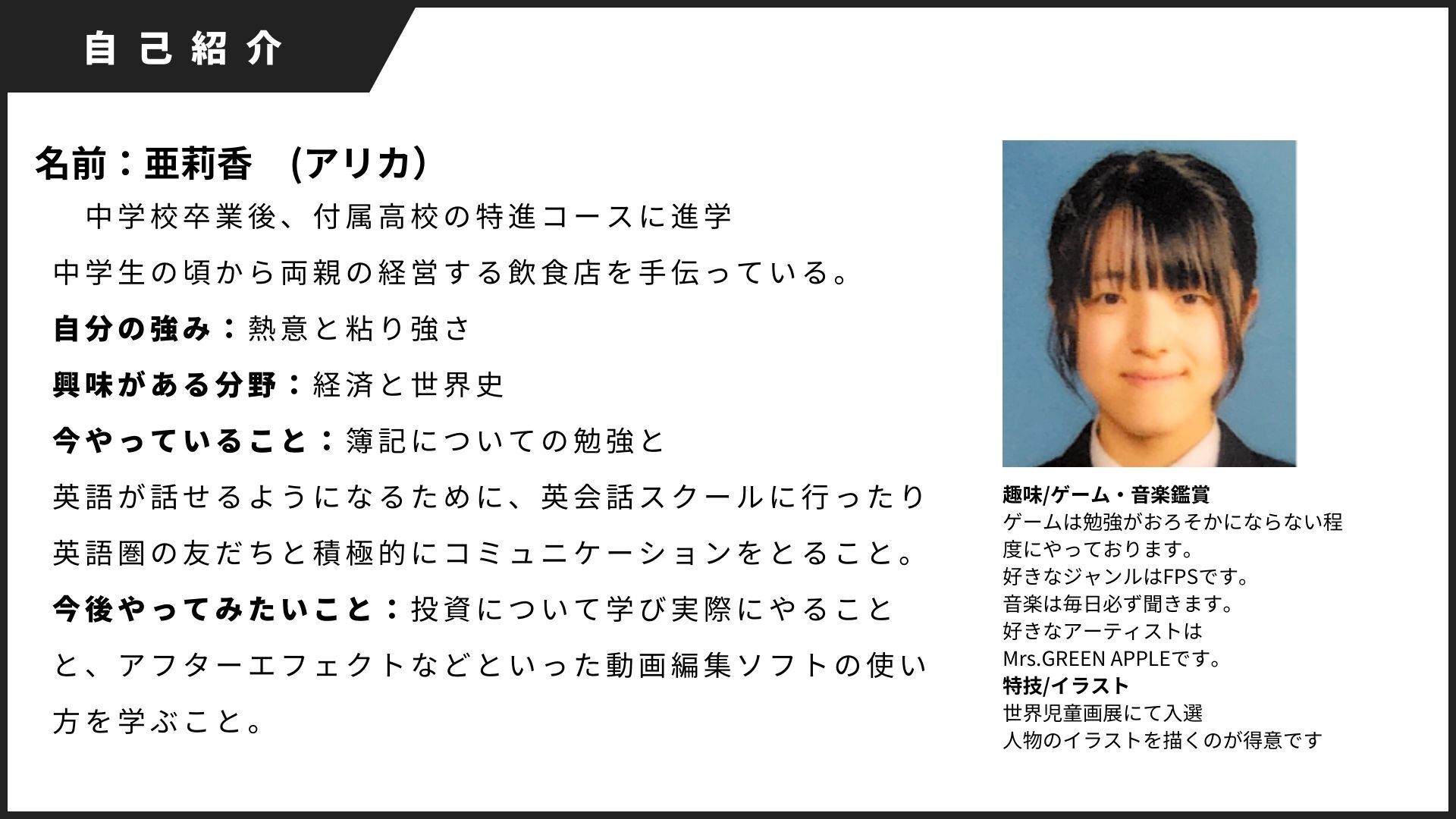 私ははっきりと将来自分が何をしたいのかがわかりませんが、多くのイノベーションによって未来が不確実な世界でも活躍できる人間になりたいと考えています。
