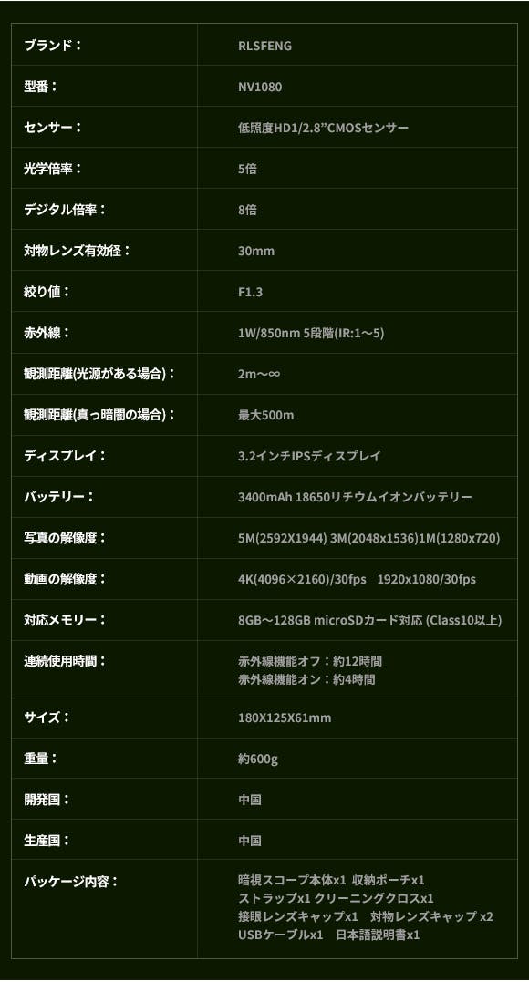 「NV1080」は昼夜問わず使える双眼鏡型暗視スコープです。5倍の光学レンズ・8倍のデジタルズーム・5段階の赤外線調整を備えており、より遠く・より大きな画像を確認でき、暗闇でも約500m先まで観察できます。
