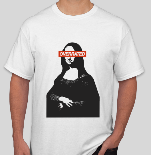 Mona Lisa -Overrated- T-shirt は、名前通り、あの有名絵画モナリザを元にデザインしました。目元を隠している"OVERRATED"は、「過大評価されている」という意味です。たくさんある芸術作品の中でなぜかモナリザだけが非常に過大評価されていることに対する皮肉なメッセージです。実際に僕もパリのルーブル美術館でモナリザを見てきましたが、Tシャツよりの小さな絵に100人ほどが群がっていました。笑