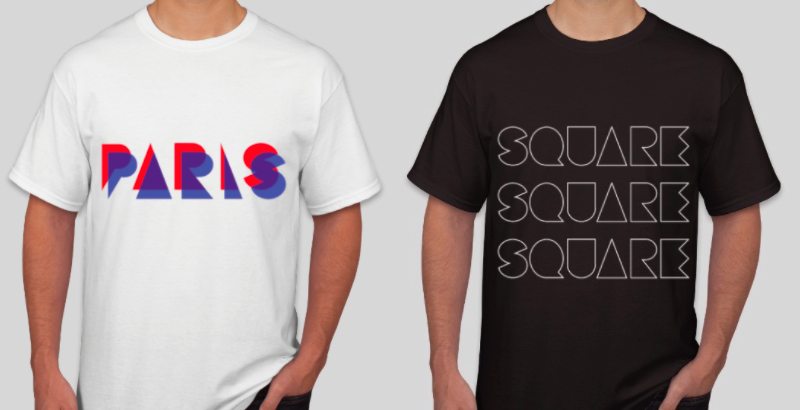 Paris T-shirt と シグネチャーTシャツのSQUARE T-shirt にそのフォントを使っています。Paris T-shirt のParis(パリ)はフランスの首都なので、フランスの国旗の色である赤と青の"PARIS"を重ねたデザインで、生地は白にしました。SQUARE T-shirtは、同じ単語を三つ並べたよりシンプルなデザインです。文字の中身を塗ってしまうと重くなりそうだったので、アウトラインだけに色をつけました。