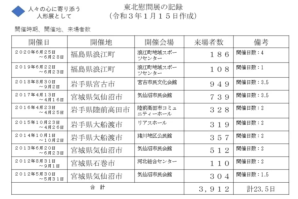 夫婦二人だけのスタッフで行う、この人形展は、現在まで46都市で127回の開催を行い、約15万人の来場をいただき、人々の心に寄り添い励ます人形展として、来場された方から高い評価をいただいています。