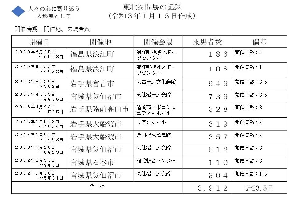夫婦二人だけのスタッフで行う、この人形展は、現在まで46都市で127回の開催を行い、約15万人の来場をいただき、人々の心に寄り添い励ます人形展として、来場された方から高い評価をいただいています。