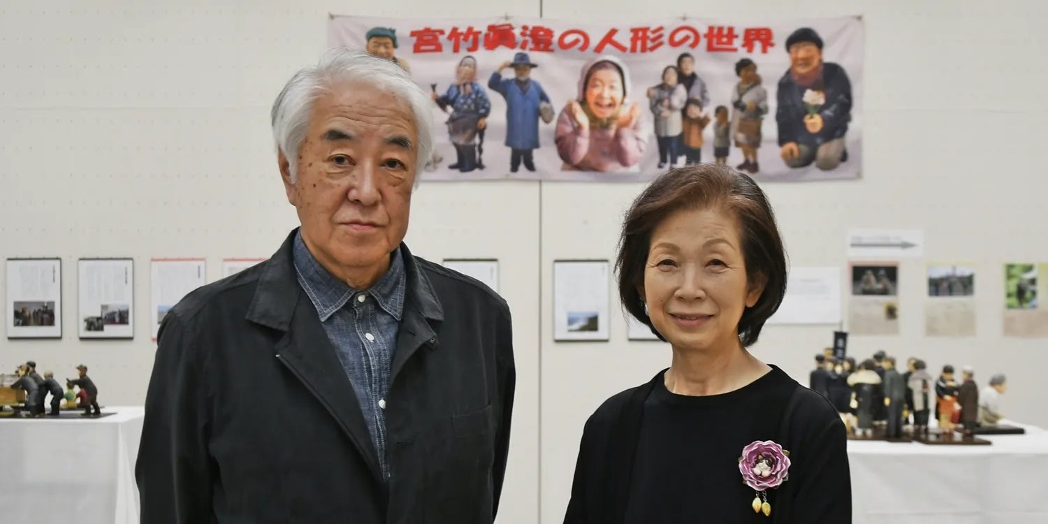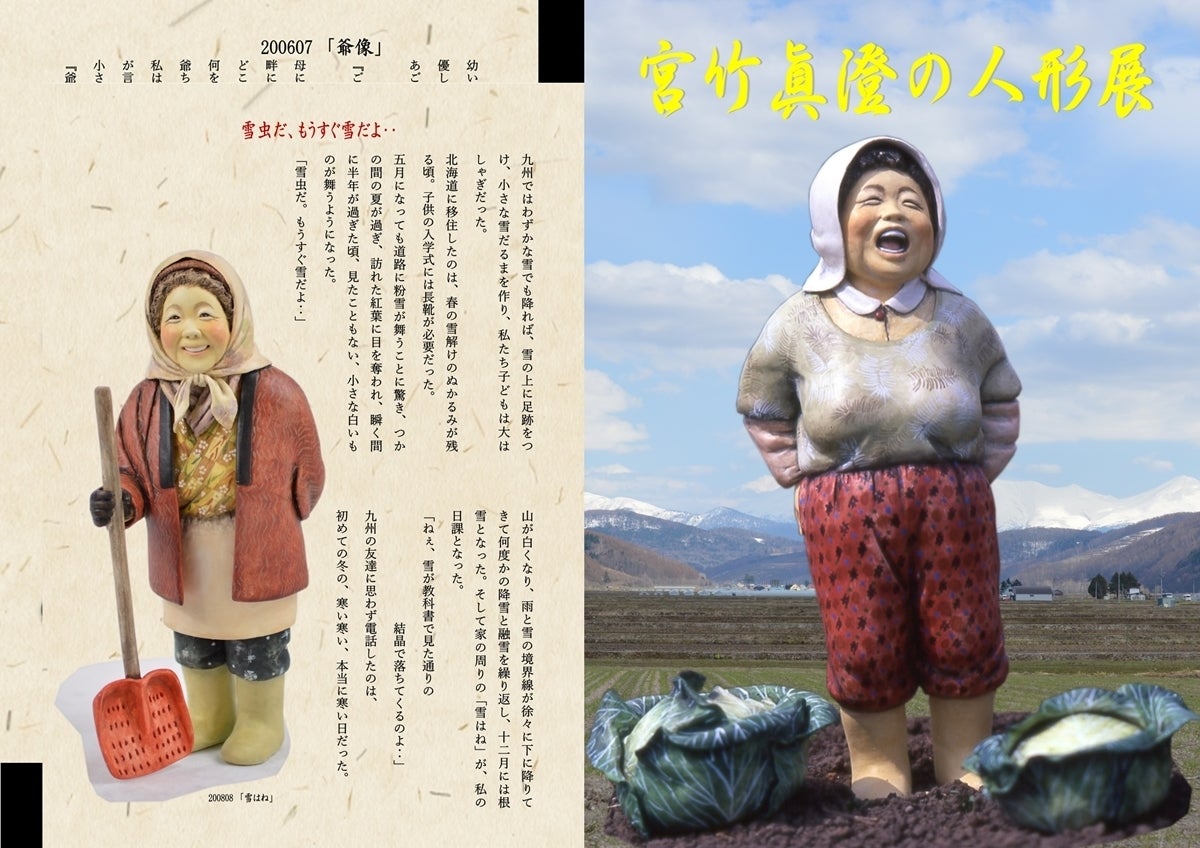 独学の人形作家・宮竹眞澄は、布を使わず粘土と水彩で表現する手法や、ごく普通の人々を題材にし、時には、いじめ、戦争、飢餓、拉致など社会的な側面をもった作品群で、独特の人形の世界を作り出してきました。北海道移住後の2006年に開催された、『道展』に初入選したのを機に自立した人形作家を目指して、『宮竹眞澄・心のふる里人形展』と名付けた全国巡回展を2008年に立ち上げました。