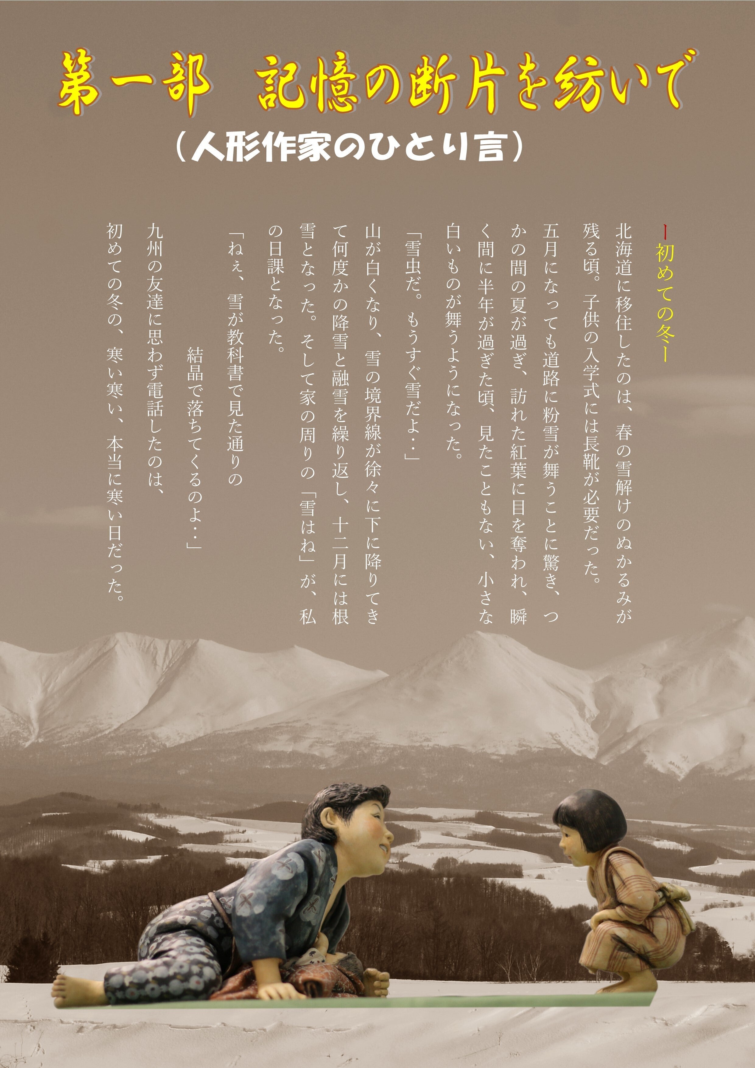第1部‥宮竹眞澄の人形の原点である思い出や、九州に生まれ~東京、神奈川~北海道へ渡った彼女の日々の思いを、その都度の作品と共に綴ったエッセイ集。