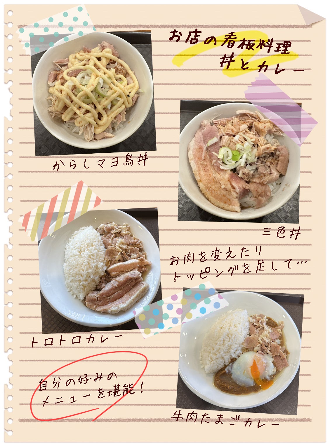カレーはたまねぎたっぷりのルーを使用しており、人気のトッピングをメニュー化したものもございますが、豚の角煮、牛の煮込み、辛子マヨなどをご自身でカスタマイズされる方も多くいらっしゃります。
