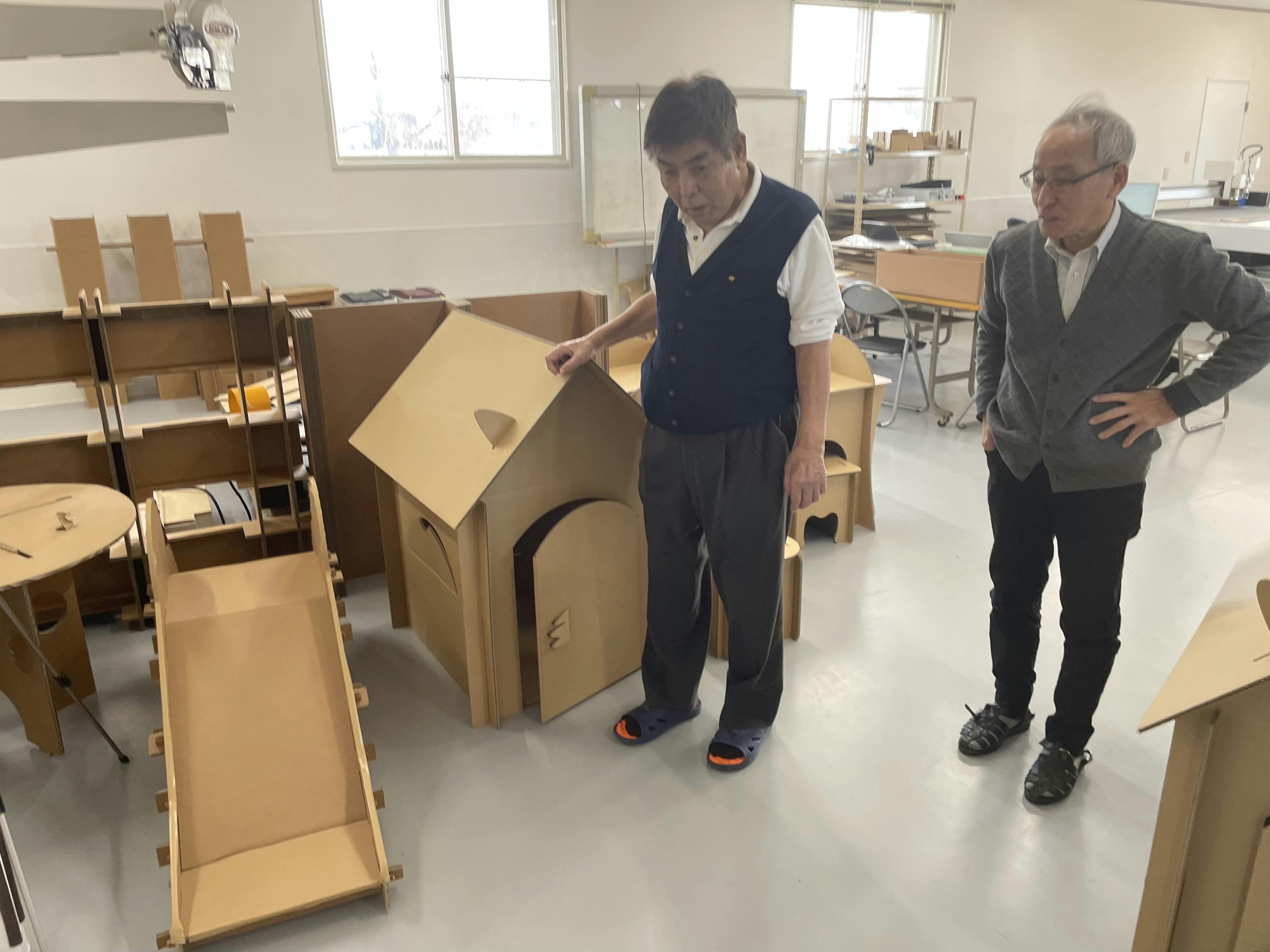 ダンボールで日々いろいろな商品を作っており、ご近所の幼稚園などに寄贈したいと話をしておりました、しかし、現在は一旦作業は「簡易トイレ」作成を中心に動いております。