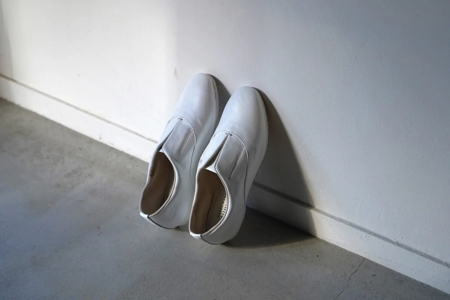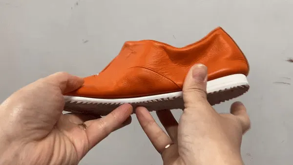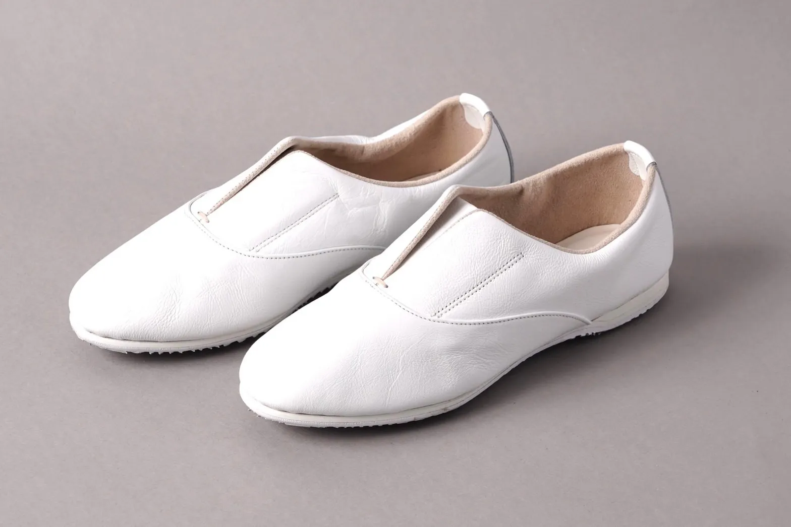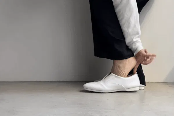 通常靴にはかかととつま先に硬い芯材が入っていますが、この靴はそれらを入れない為、クタっと柔らかく、様々な足の形になじみ包み込まれる優しい履き心地を実現しました