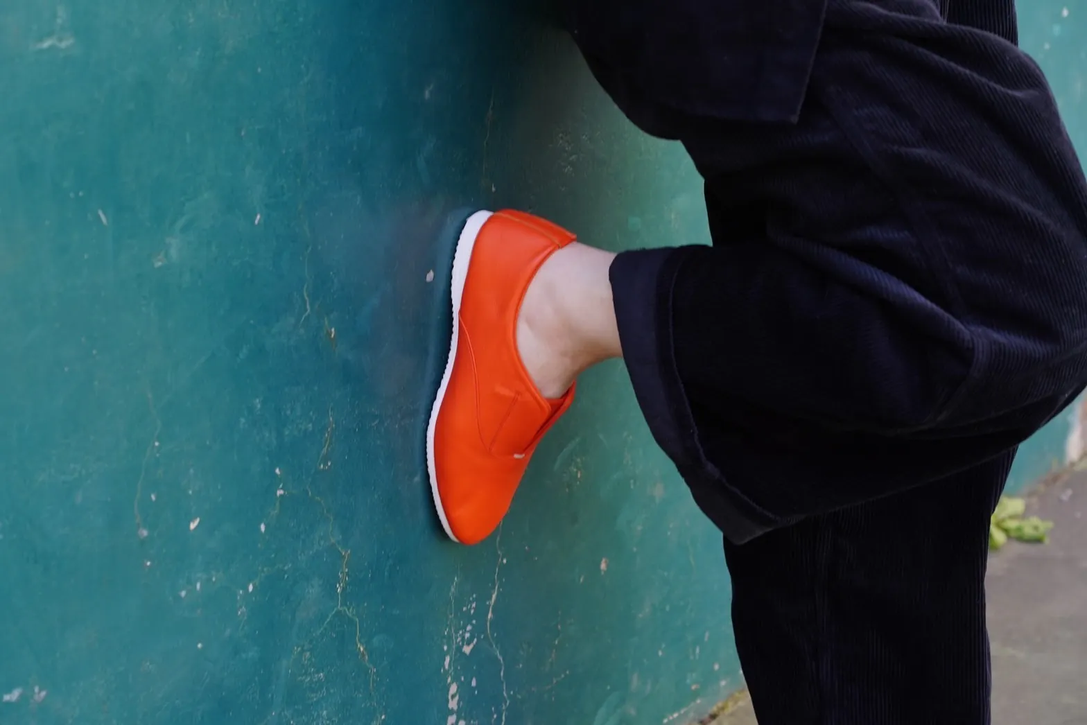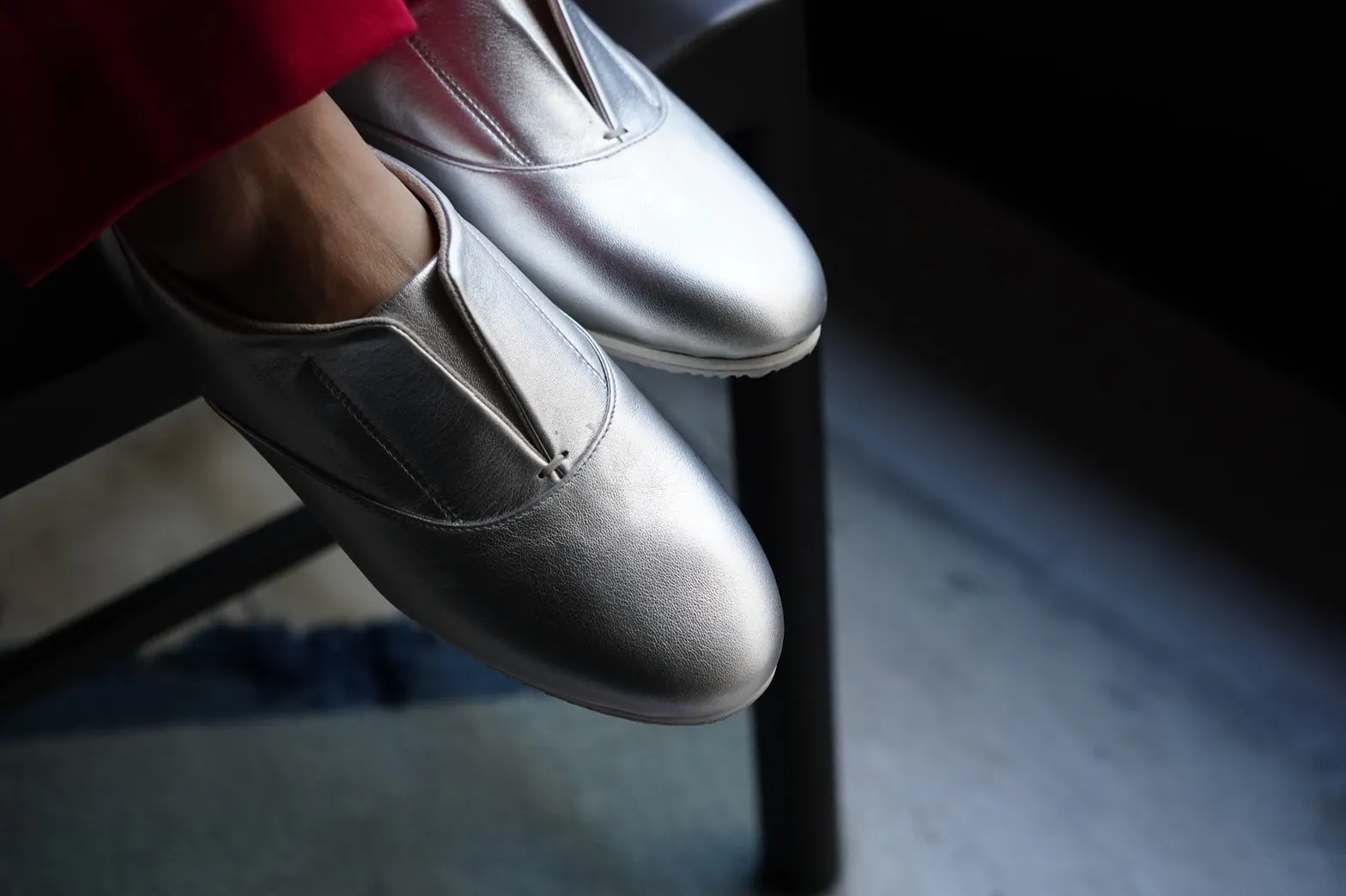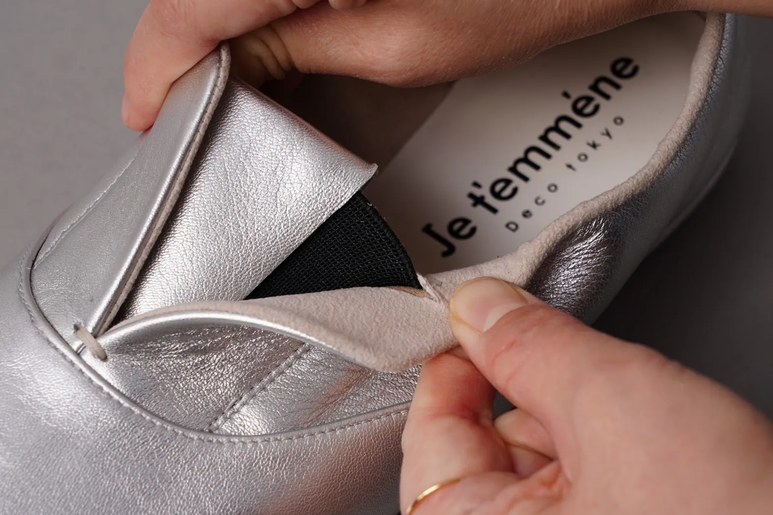 通常靴にはかかととつま先に硬い芯材が入っていますが、この靴はそれらを入れない為、クタっと柔らかく、様々な足の形になじみ包み込まれる優しい履き心地を実現しました