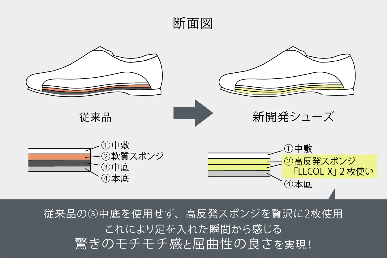 更に従来のクッション構造をより進化させクッション性の高い新素材高反発スポンジ「LECOL-X」を中敷きと靴底の間に贅沢に2枚使用