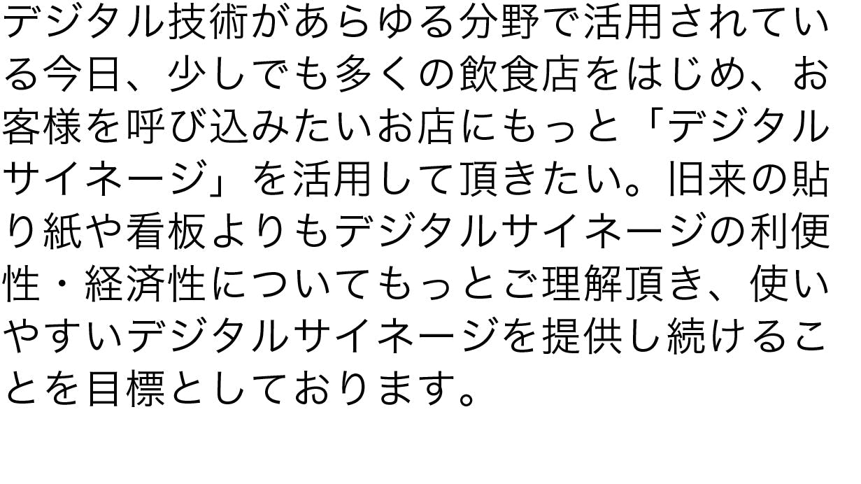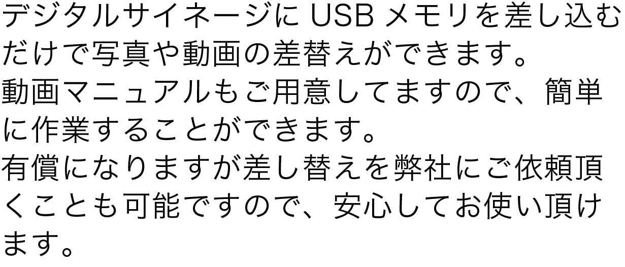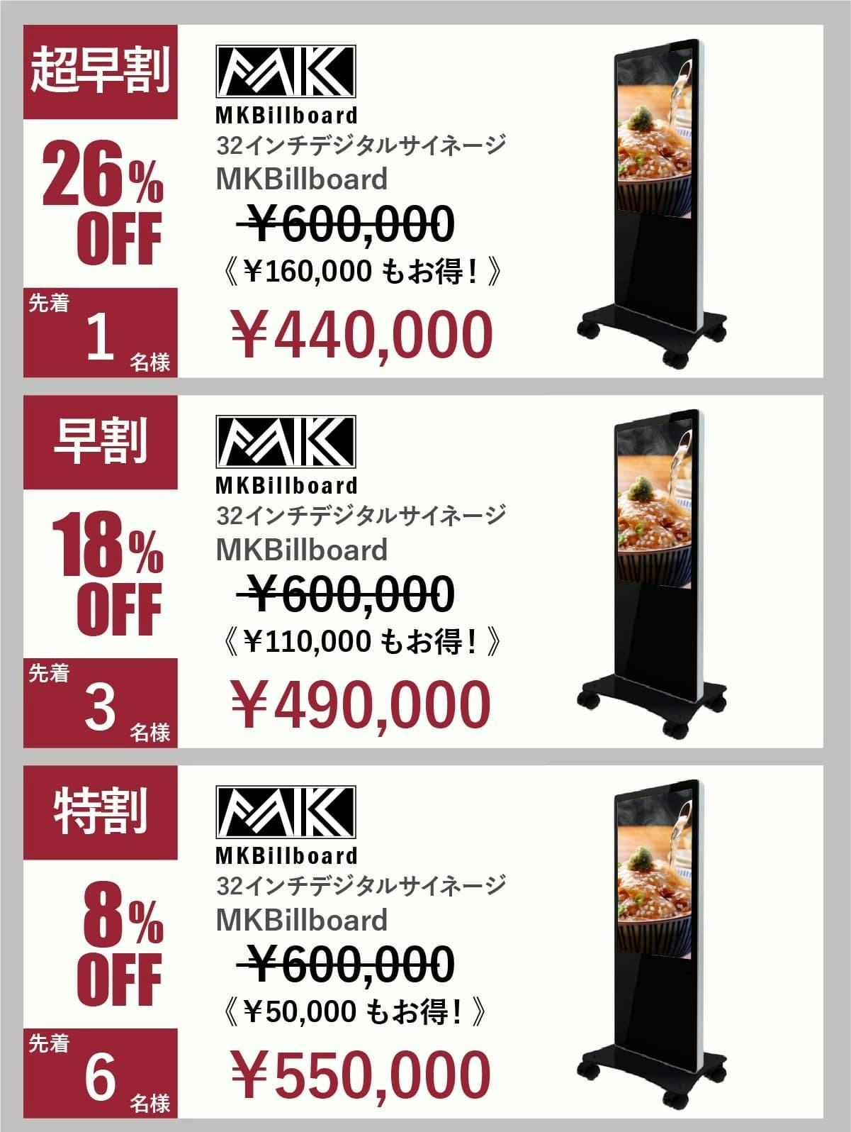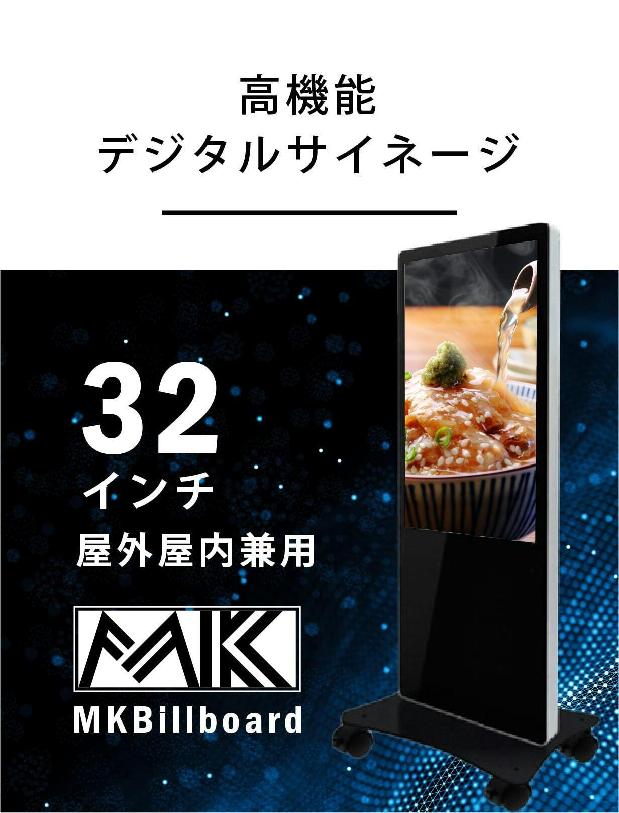 デジタルサイネージならMKBillboardがオススメです。屋外屋内兼用で防水防塵32インチかつ、高輝度!しかも時給換算で51円で集客してくれます!アフターフォローも万全!2年保証付きです!
