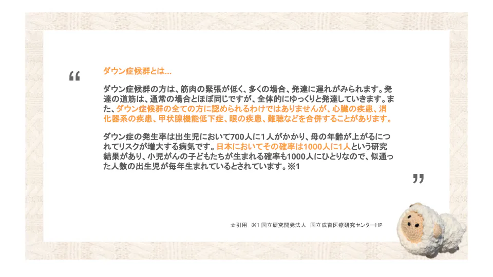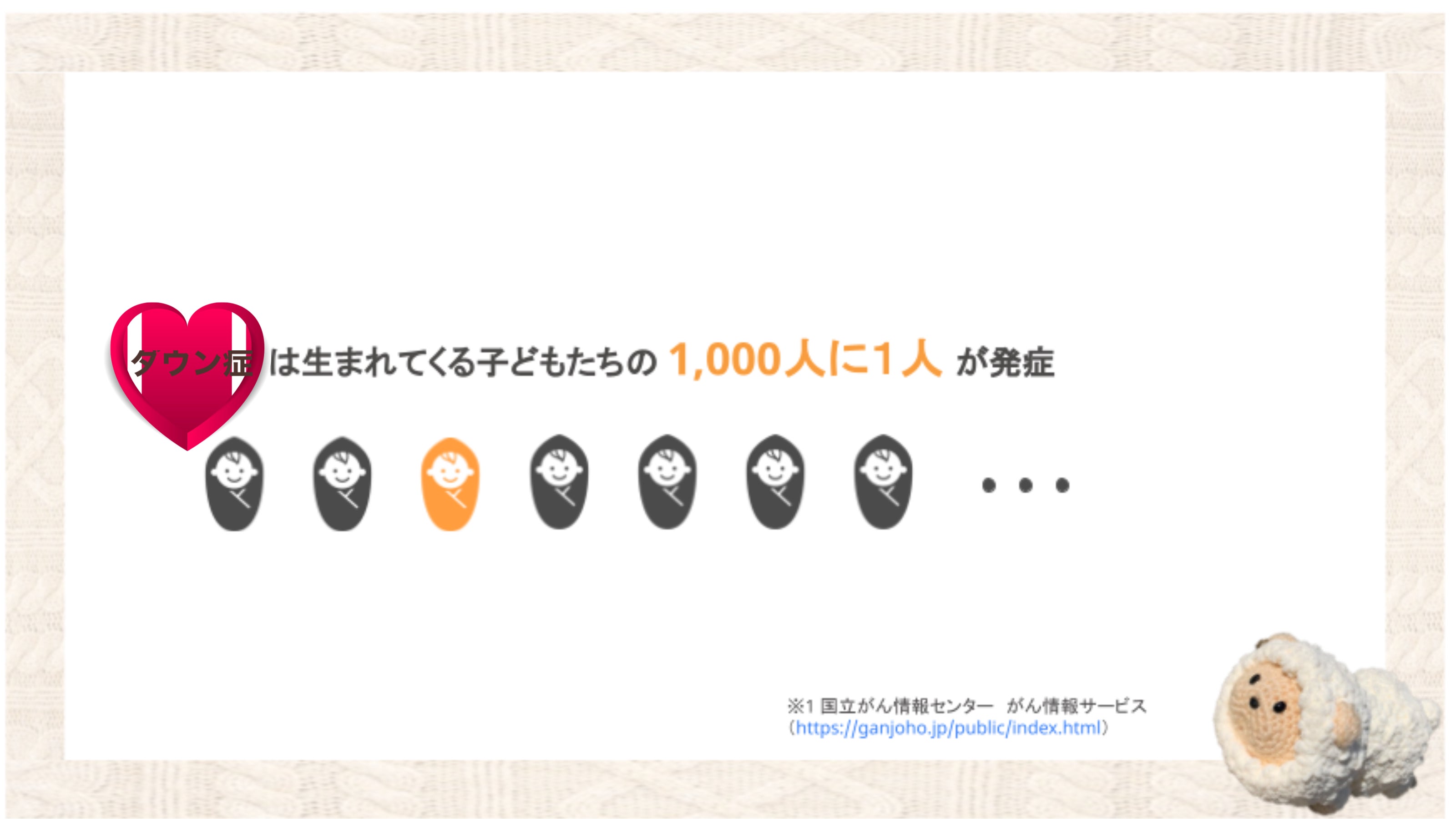 ダウン症の発生率は出生児において700人に1人がかかり、母の年齢が上がるにつれてリスクが増大する病気です。日本においてその確率は1000人に1人という研究結果があり、小児がんの子どもたちが生まれる確率も1000人にひとりなので、似通った人数の出生児が毎年生まれているとされている。※1
