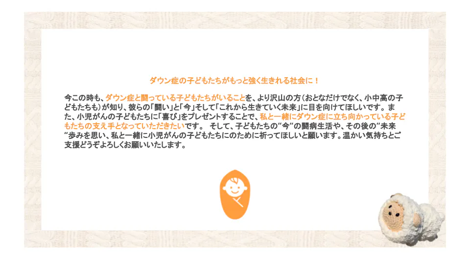 しかしその事実はあまり公表されておらず、認知度も低いものとなっています。もっと沢山の方に、今この時も小さな身体で病と闘っている子ども達がいることを知ってもらうために、子どもたちに“あなた“と”私(ステージ4の大腸がんの編みぐるみ作家)が手を取り合ってダウン症の子ども達に“編みぐるみ“をプレゼントしましょう。