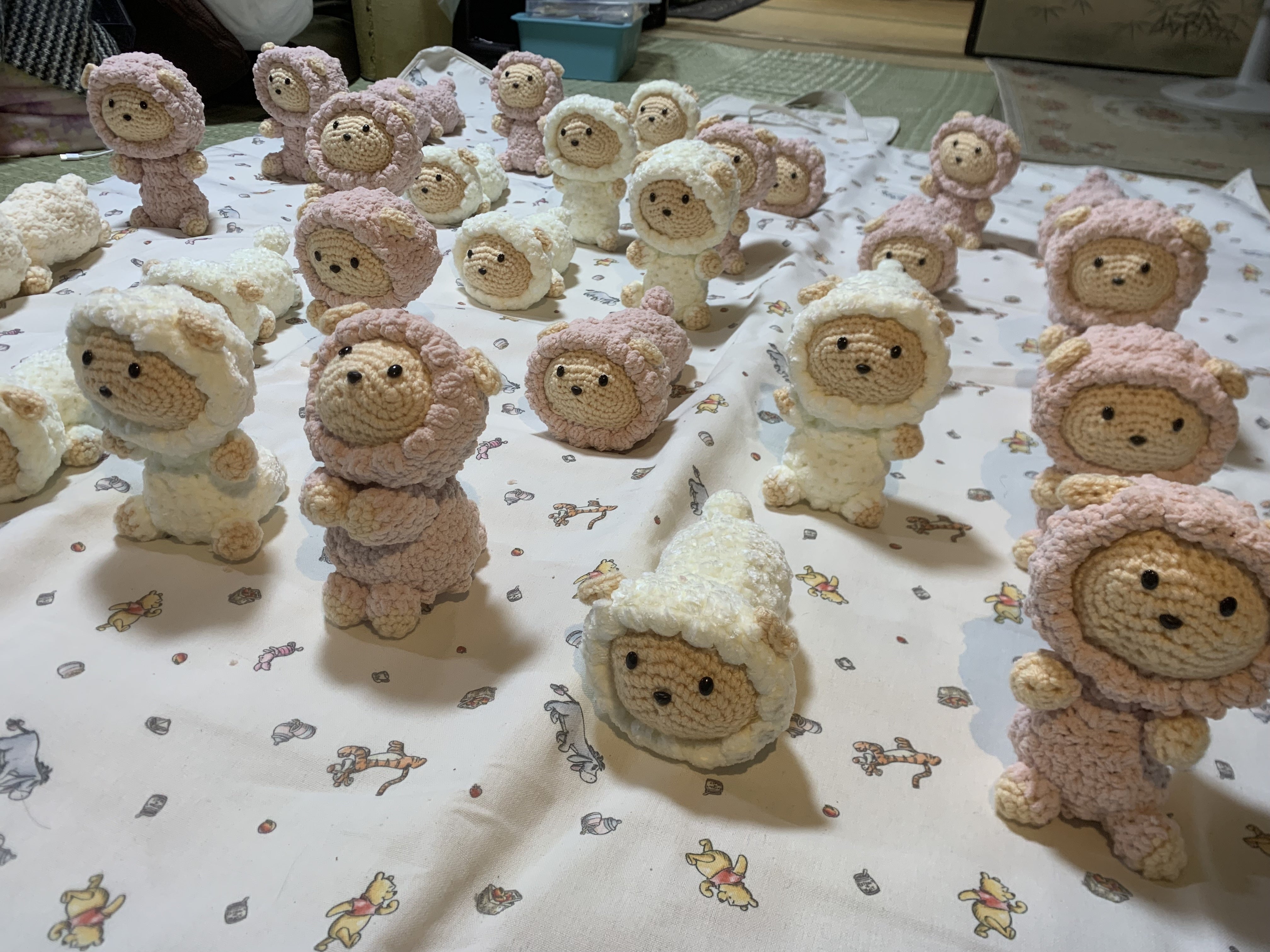編み物歴は20年、作品数は1000作品を超えました。2021年に治療費の足しにと「編みぐるみ」の販売を始め、これがとても好評で沢山の方に購入いただき、2022年では1年で178作品を製作、販売するに至りました。いちからデザインして設計、製作する編みぐるみは「品がある」、「かわいい」と大好評です。 編みぐるみを製作して、沢山の方にもらっていただき、喜びの声が返ってくることは本当に幸せなことであり、辛い大腸癌の治療を耐え抜く力となっています。
