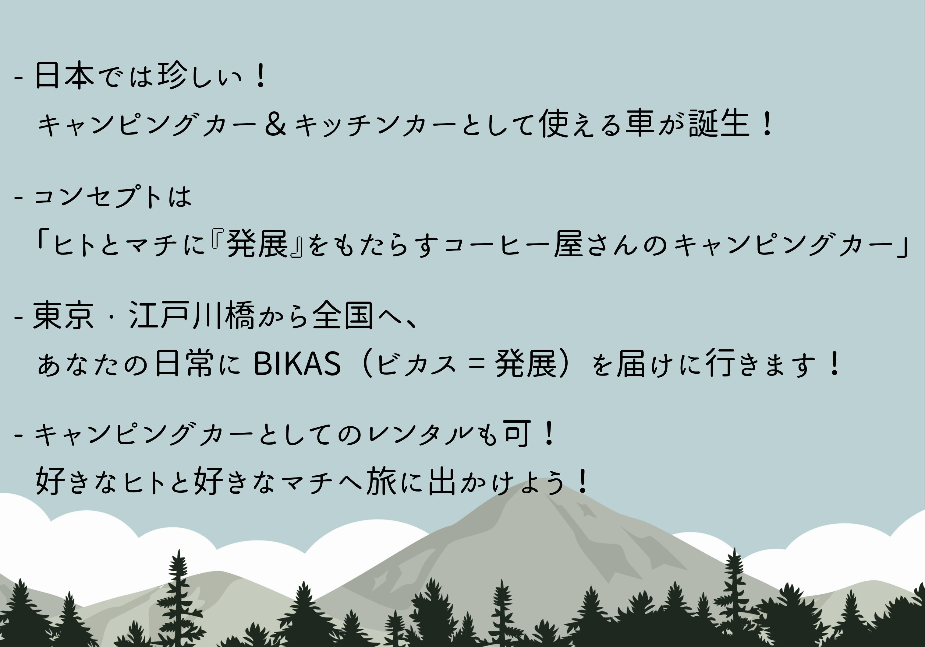 ぜひ、この車で多くの方にBIKASさんのコーヒーが届くように、キャンピングカーとして更なる旅やキャンプの魅力が届くよう、応援しております。
