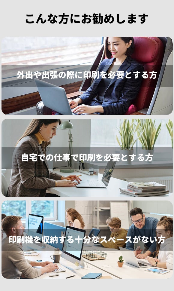 外出や旅行中に急に印刷が必要になった時、このような小型プリンターを携帯していると非常に便利です。車の中でも、空港や駅でも、いつでもどこでも使用できます。