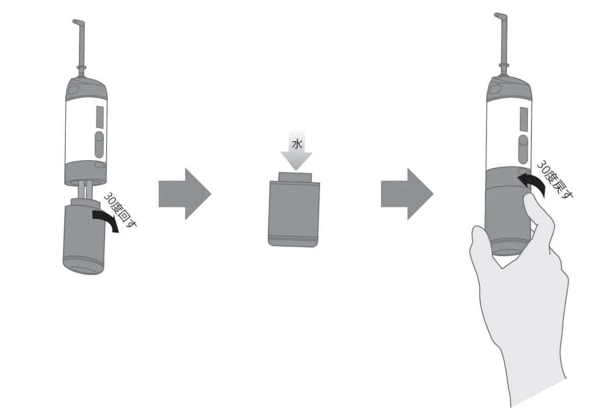 30 °右に回してタンクを外し、タンクに水・ぬるま湯を入れます
