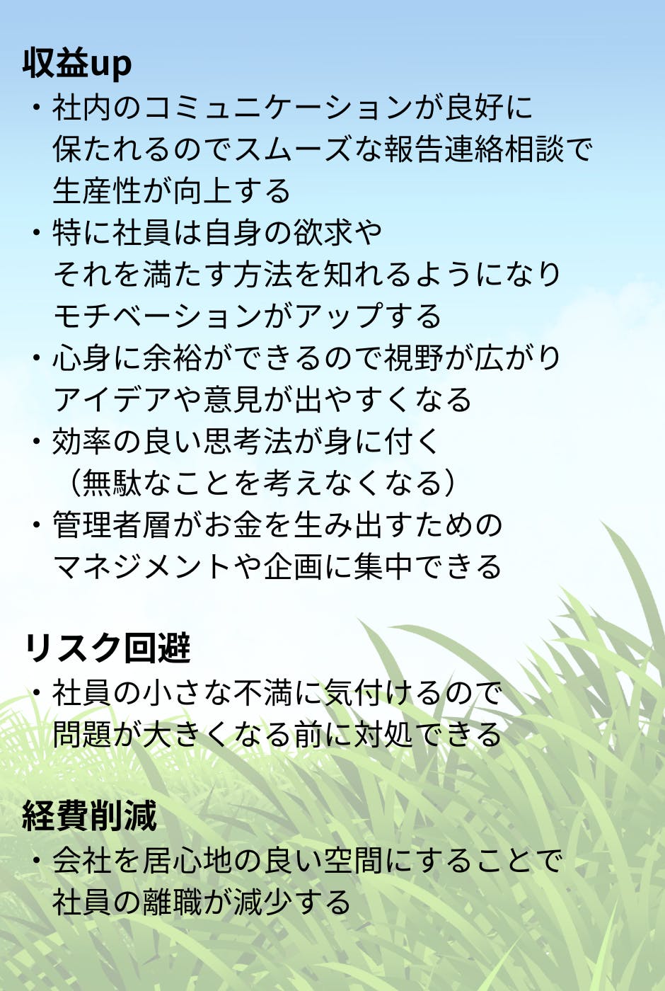 なぜならプロが社員と管理者のそれぞれを対象としてコーチングやカウンセリングのスキルを活用した対話を定期的に行えば企業は下記のような収益増加/経費削減/リスク回避の恩恵を受けられるからです。
