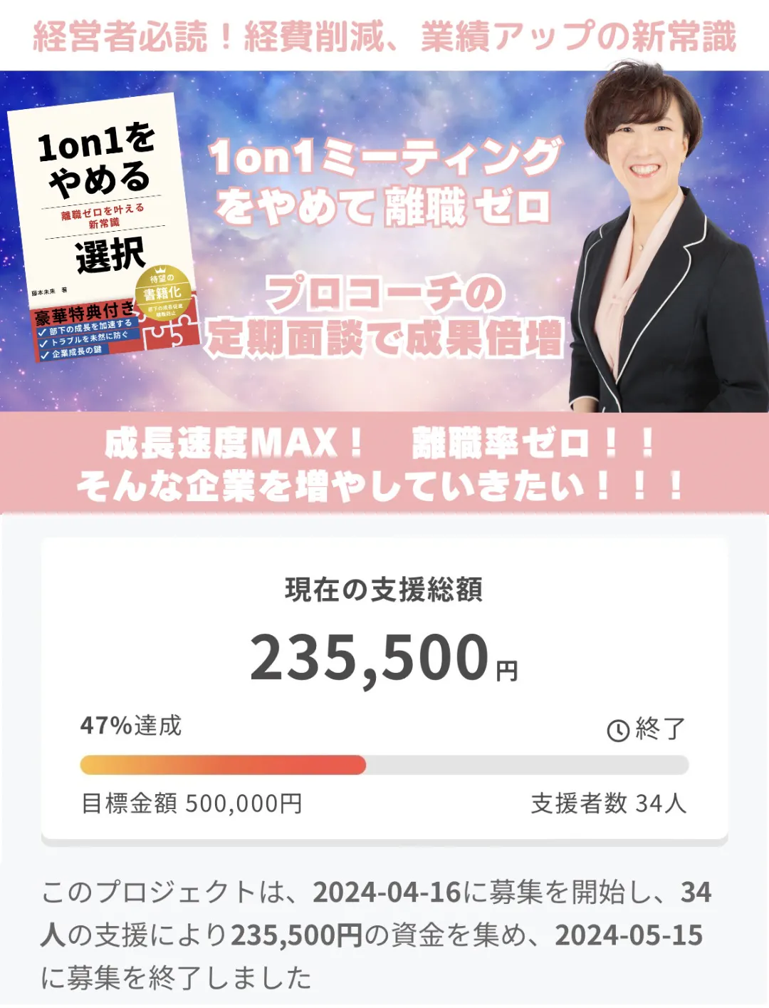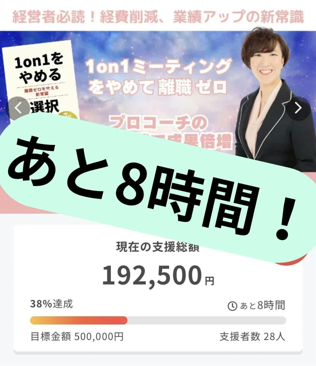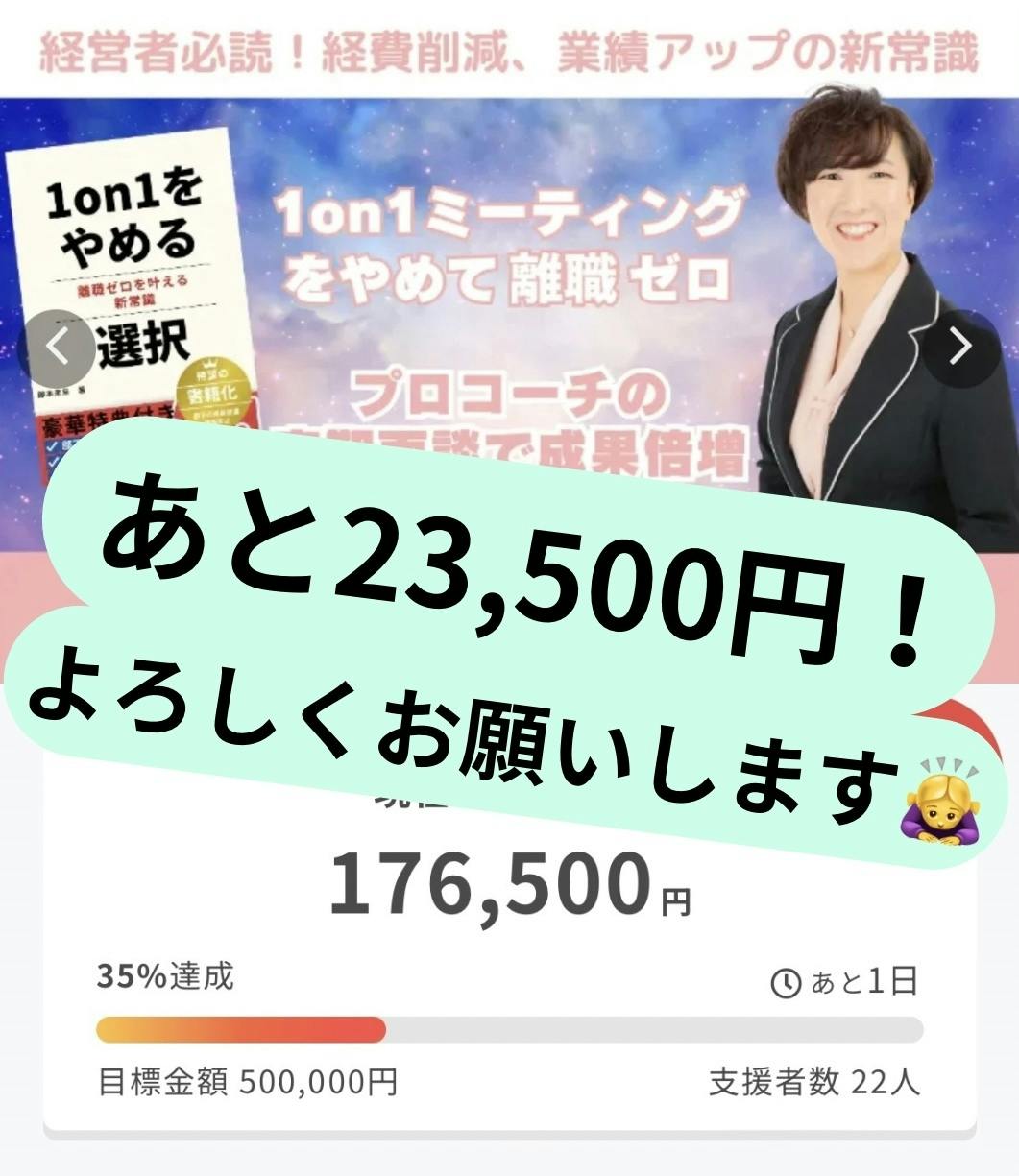 2024/05/25 19:40こんばんは。1on1ミーティングをやめて離職ゼロを叶える離職防止コーチの藤本未来です。かなり日数がたってしまいましたが、無事、クラウドファンディングが終了しました。支援総額:235,500円支援者数:34人書籍:65冊沢山の方に応援していただいて、大変ありがたいです。でも、ちょっと足りないのでセカンドチャレンジ頑張ります!ここでもそのあたりの情報をお伝えするので是非、お気に入り登録しておいて下さい。ちなみに早速ですが、ライブ配信にゲストで読んで下さる方を探してます。ご自身でも周りの方でも、もし可能性があれば声をかけて下さい。引き続き、どうぞよろしくお願いします。 もっと見る